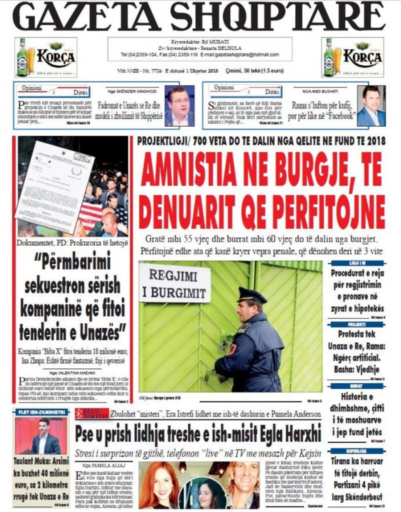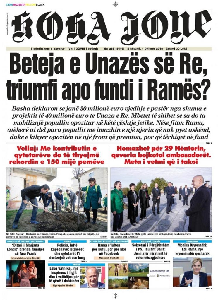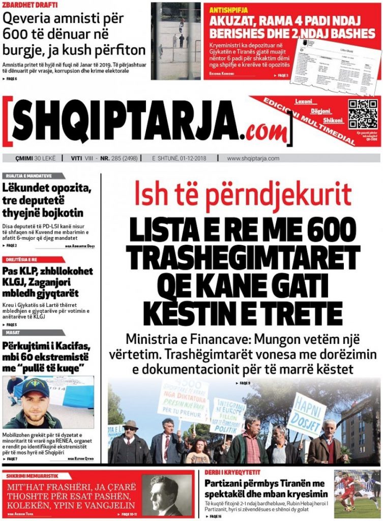Faqet e para të shtypit të ditës, datë 1 dhjetor 2018 KryesoretRisi By Pa frike Last updated Dhj 1, 2018 118 Këto janë faqet e para të shtypit të ditës, datë 1 dhjetor 2018: faqet e parashtypi i dites 118 Ndaj FacebookTwitterLinkedinGoogle+