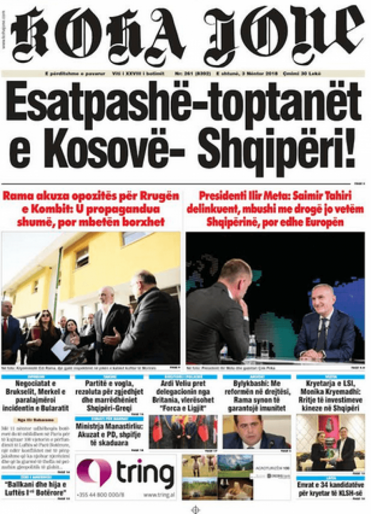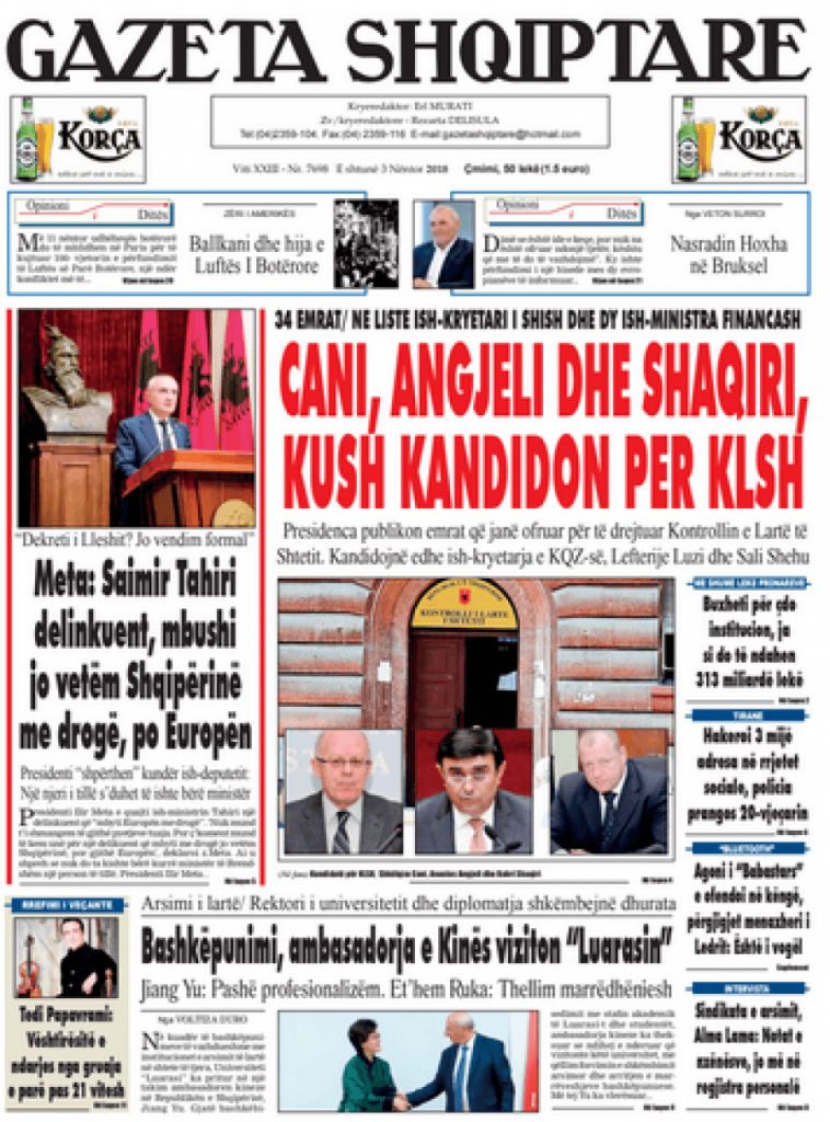 Faqet e para të shtypit të ditës, datë 3 nëntor 2018 KryesoretRisi By Pa frike Last updated Nën 3, 2018 99 Këto janë faqet e para të shtypit të ditës, datë 3 nëntor 2018: faqet e parashtypi i dites 99 Ndaj FacebookTwitterLinkedinGoogle+