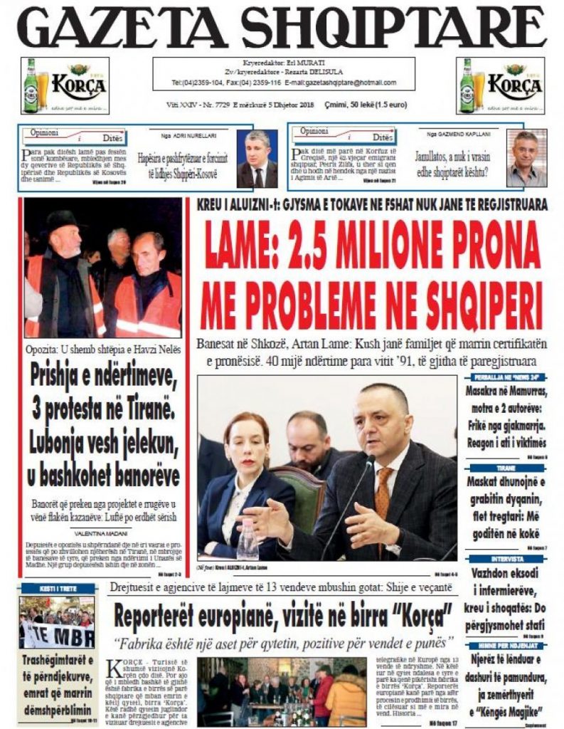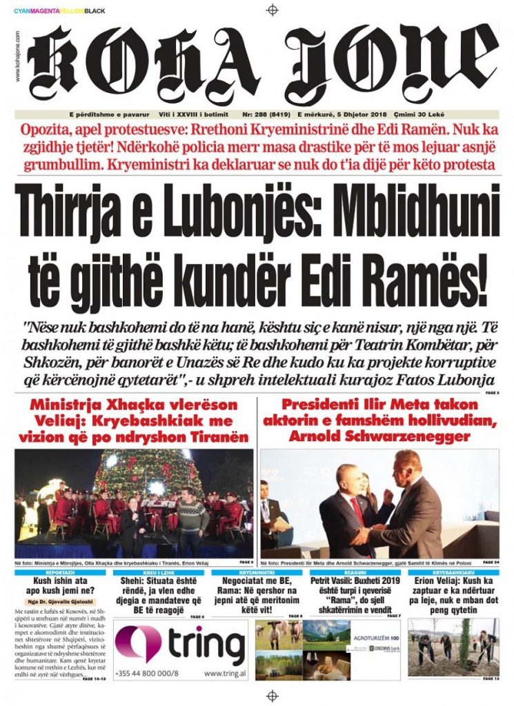 Faqet e para të shtypit të ditës, datë 5 dhjetor 2018 KryesoretRisi By Pa frike On Dhj 5, 2018 166 Këto janë faqet e para të shtypit të ditës, datë 5 dhjetor 2018: faqet e parashtypi i dites 166 Ndaj FacebookTwitterLinkedinGoogle+