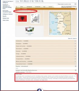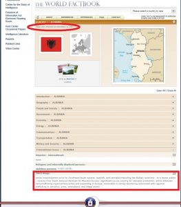 ‘The World Factbook’, është i publikuar në faqen zyrtare të CIA-s. Ky është një produkt i kësaj organizate që përditësohet në mënyrë të përjavshme dhe përmbajtja është lehtësisht e aksesueshme online. Pra, megjithëse përditësimi i fundit është i datës 14 gusht 2018, theksojmë se ky është një përditësim i ‘Factbook’ si i tërë dhe jo i të dhënave specifike për Shqipërinë.