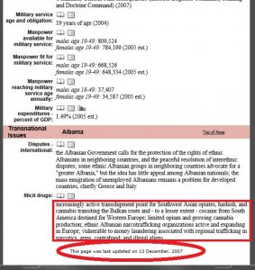 Aktualisht për Shqipërinë, ‘Factbook’ ka të njëjtën përmbajtje me atë të vitit 2017 dhe ky tekst, me ndryshime të vogla, është pothuajse i njëjtë me atë të publikuar gjatë periudhës 2007 – 2016. Bashkëlidhur me këtë njoftim përcjellim edhe fotot ‘print-screen’ të faqeve përkatëse të ‘Factbook’ sipas viteve.