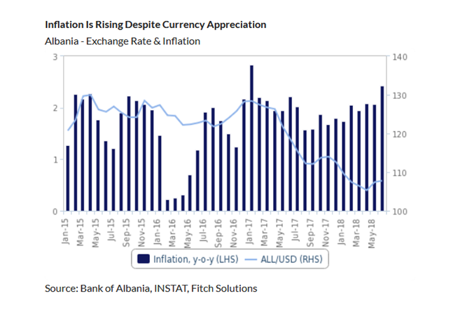 Me rënien e papunësisë dhe pjesëmarrjen e fuqisë punëtore në rritje, pagat ka të ngjarë të vazhdojnë të rriten. Në lidhje me çmimet më të larta botërore të naftës, ne besojmë, se do të nxisë inflacionin të vazhdojë të rritet drejt objektivit të Bankës së Shqipërisë prej 3.0%. Kjo jo vetëm që do të dëmtojë fuqinë blerëse, por ka të ngjarë që autoritetet monetare të shtrëngojnë më shpejt politikën monetare sesa që ishte planifikuar, gjë që do të siguronte shenja për investime. Në deklaratën më të fundit të politikës monetare, Banka e Shqipërisë deklaroi se “intensiteti i stimulit monetar nuk do të pakësohet para tremujorit të dytë të vitit 2019”. Megjithatë, ne besojmë se rritja e çmimeve do të çojë autoritetet që të fillojnë të forcojnë politikën gjatë tremujorit të fundit të vitit 2018