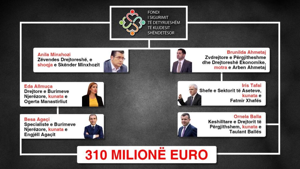 Nga një anë, është Arben Ahmetaj dhe Ogerta Manastirliu që, si anëtarë të Këshillit Drejtues vendosin për Fondin e Sigurimit Shëndetësor, nga ana tjetër janë motrat dhe kunatat e tyre që firmosin për dërgimin e parave në llogaritë e klientëve të qeverisë.