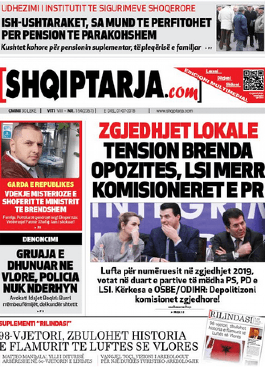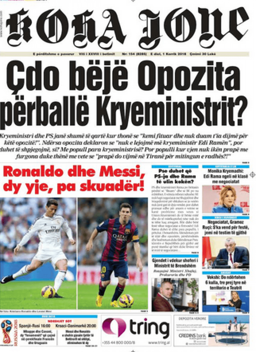 FOTO/ Faqet e para të shtypit të ditës, 1 Korrik 2018… KryesoretRisi By Pa frike Last updated Kor 1, 2018 65 Këto janë titujt kryesorë të gazetave të datës 1 Korrik 2018. faqet e paragazetatshtypi i dites 65 Ndaj FacebookTwitterLinkedinGoogle+
