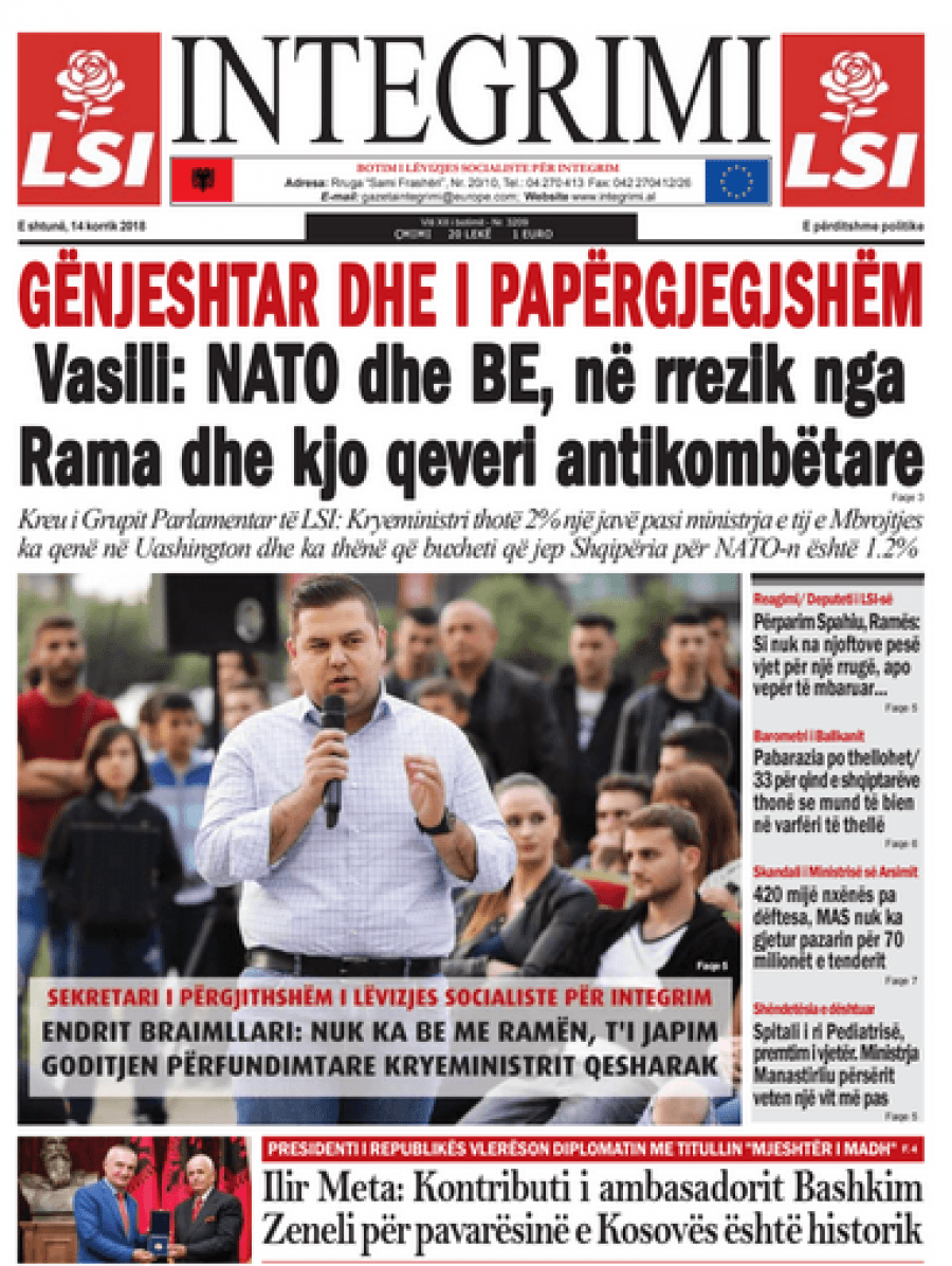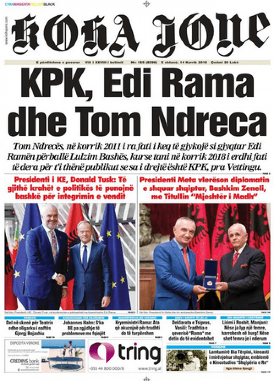 FOTO/ Faqet e para të shtypit të ditës, 14 korrik 2018… KryesoretRisi By Pa frike Last updated Kor 14, 2018 100 Këto janë titujt kryesorë të gazetave të datës 14 Korrik 2018. faqet e paragazetatshtypi i dites 100 Ndaj FacebookTwitterLinkedinGoogle+