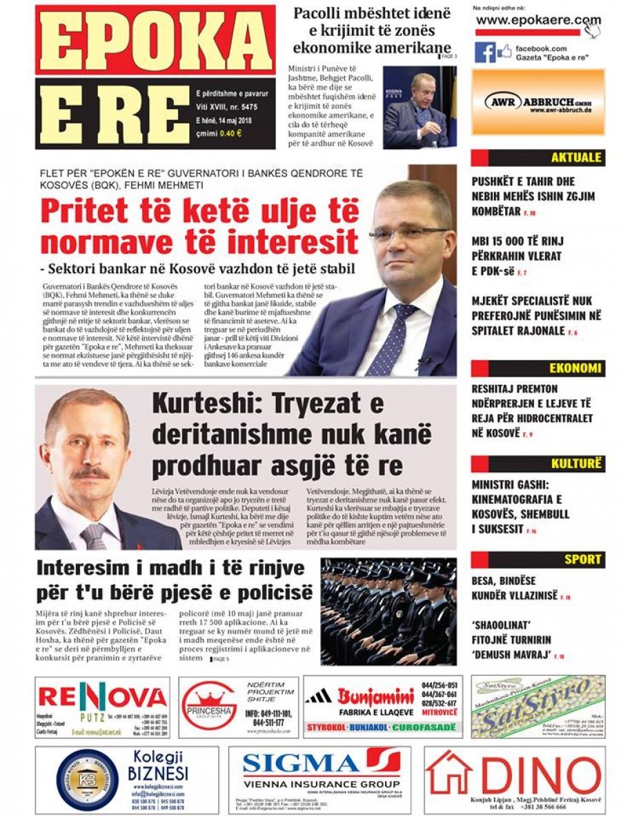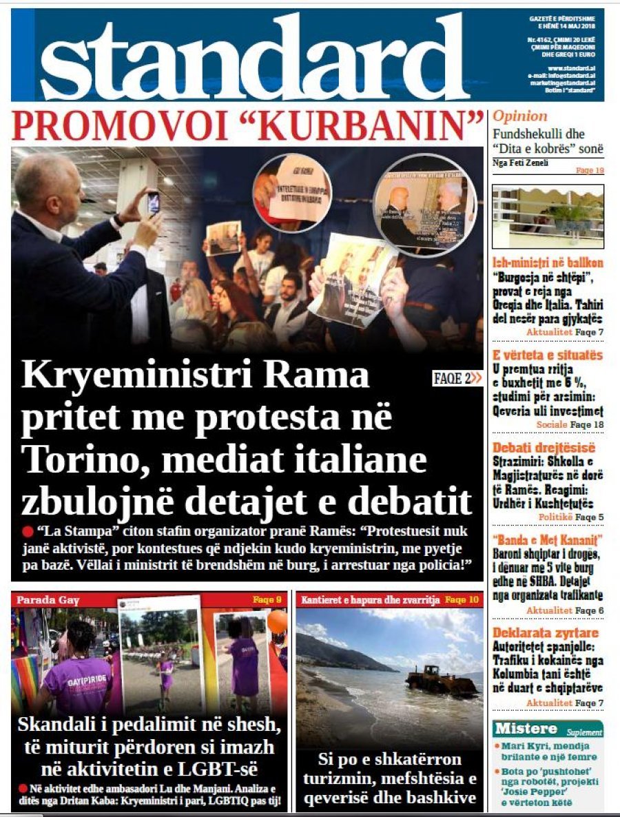 FOTO/ Faqet e para të shtypit të ditës, 14 maj 2018… KryesoretRisi By Pa frike Last updated Maj 14, 2018 148 Këto janë titujt kryesorë të gazetave të datës 14 maj 2018. shtypi i dites gazetat faqet e para mediat 148 Ndaj FacebookTwitterLinkedinGoogle+