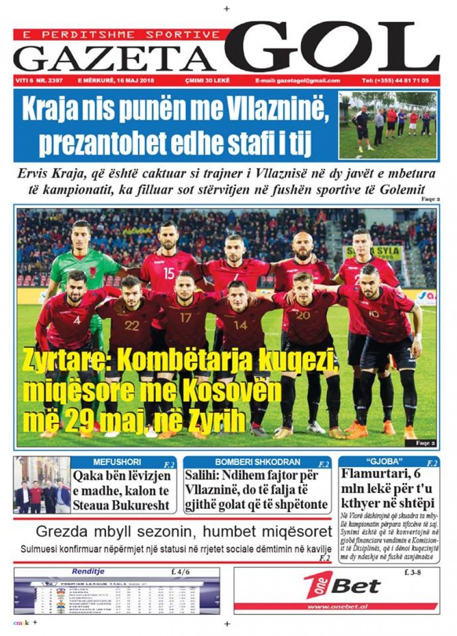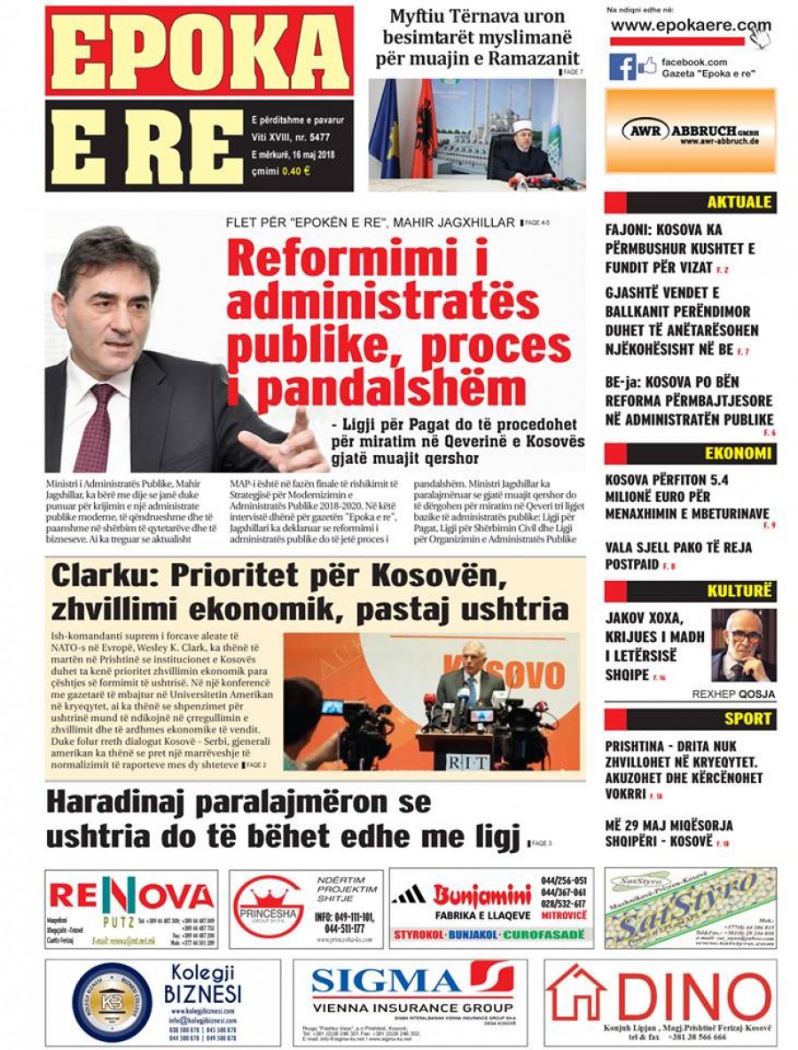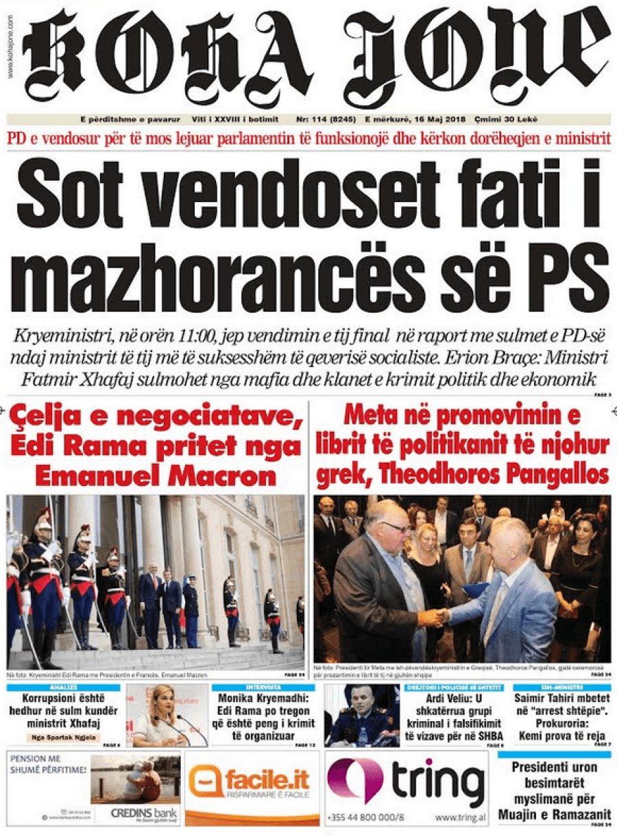 FOTO/ Faqet e para të shtypit të ditës, 16 maj 2018… RisiKryesoret By Pa frike Last updated Maj 16, 2018 92 Këto janë titujt kryesorë të gazetave të datës 16 maj 2018. faqet e paragazetatshtypii dites 92 Ndaj FacebookTwitterLinkedinGoogle+