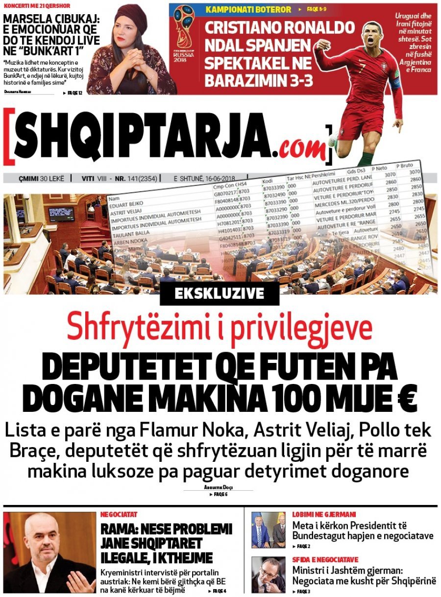 FOTO/ Faqet e para të shtypit të ditës, 16 Qershor 2018… KryesoretRisi By Pa frike Last updated Qer 16, 2018 85 Këto janë titujt kryesorë të gazetave të datës 16 Qershor 2018. faqet e paragazetatshtypi i dites 85 Ndaj FacebookTwitterLinkedinGoogle+