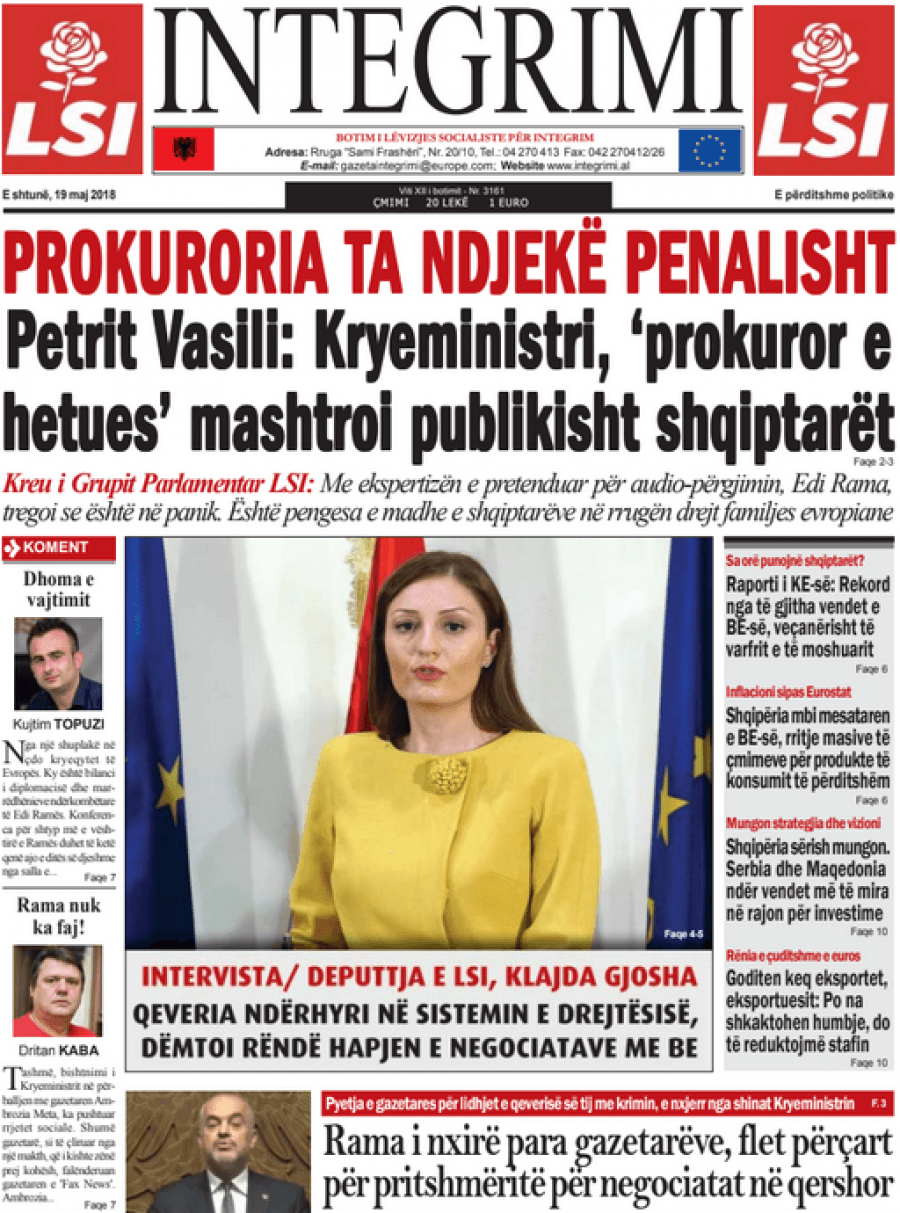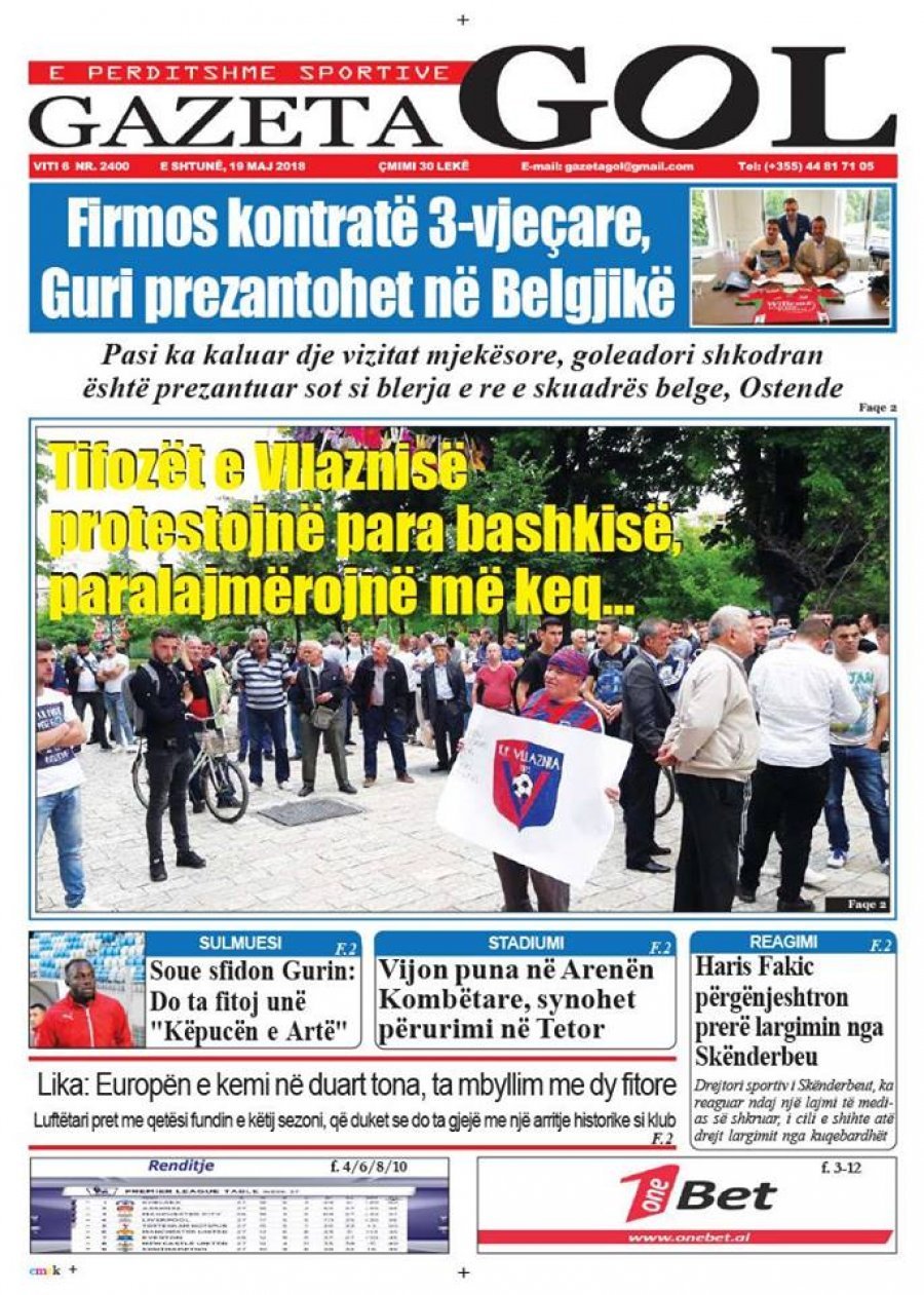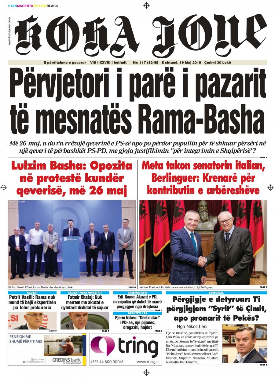 FOTO/ Faqet e para të shtypit të ditës, 19 maj 2018… KryesoretRisi By Pa frike Last updated Maj 19, 2018 106 Këto janë titujt kryesorë të gazetave të datës 19 maj 2018. faqet e paragazetatshtypi i dite 106 Ndaj FacebookTwitterLinkedinGoogle+