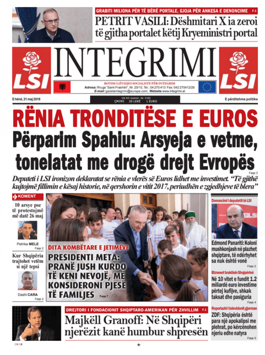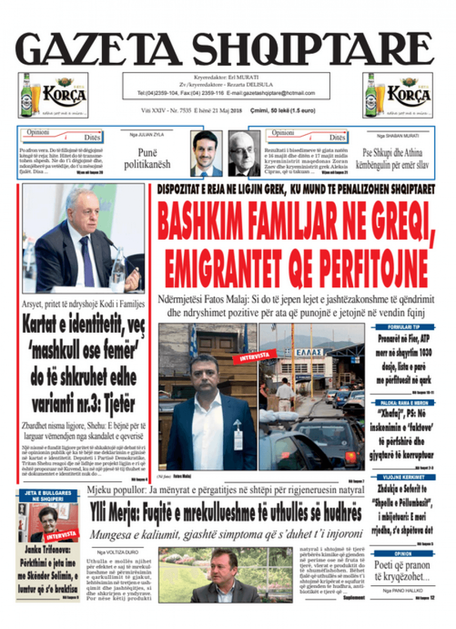 FOTO/ Faqet e para të shtypit të ditës, 21 maj 2018… KryesoretRisi By Pa frike Last updated Maj 21, 2018 85 Këto janë titujt kryesorë të gazetave të datës 21 maj 2018. faqet e paragazetatpasqyra e shtypit 85 Ndaj FacebookTwitterLinkedinGoogle+