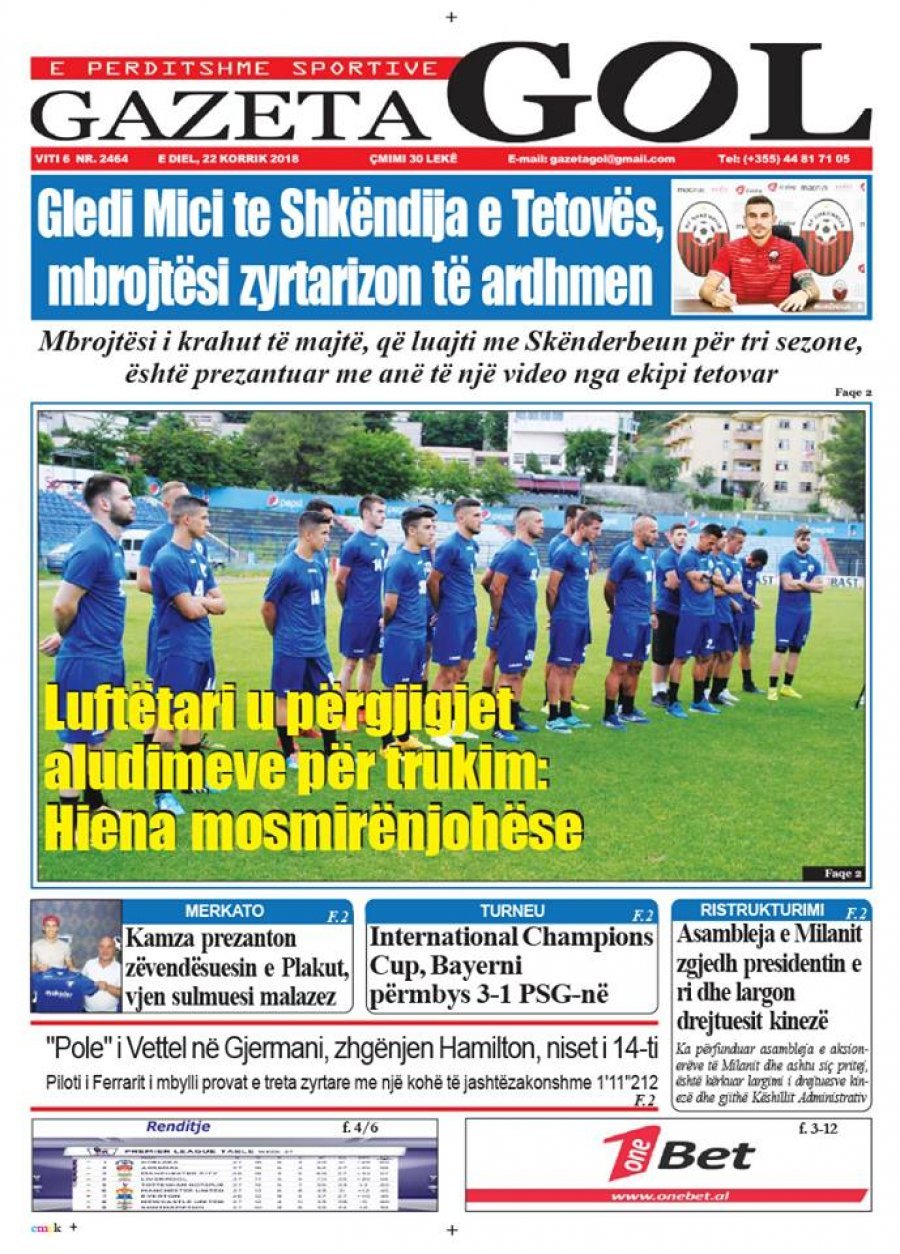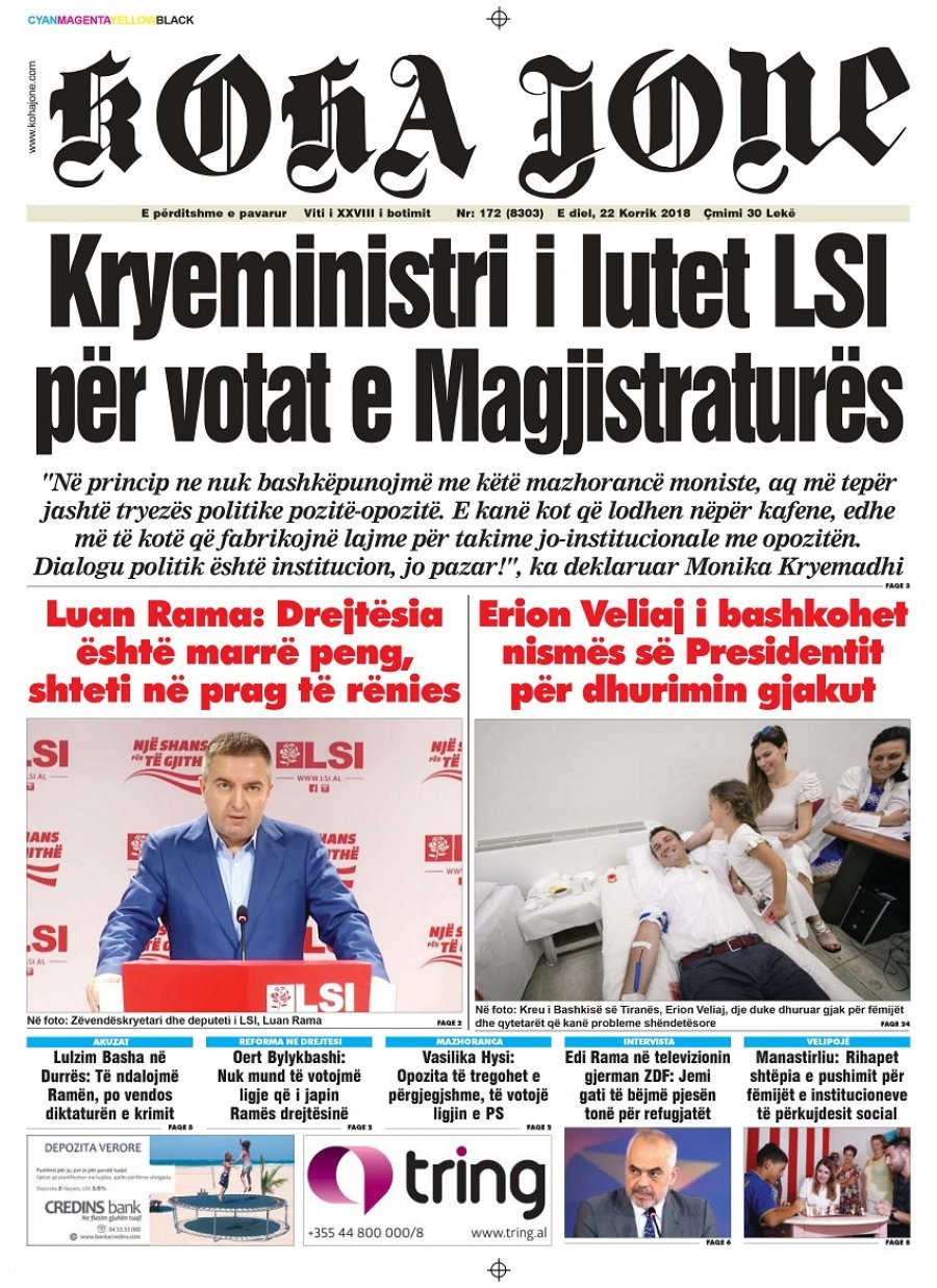 FOTO/ Faqet e para të shtypit të ditës, 22 korrik 2018… KryesoretRisi By Pa frike Last updated Kor 22, 2018 128 Këto janë titujt kryesorë të gazetave të datës 22 Korrik 2018. faqet e paragazetatshtypi i dites 128 Ndaj FacebookTwitterLinkedinGoogle+