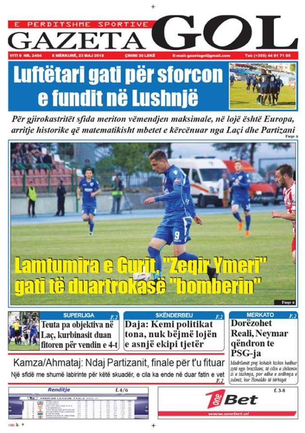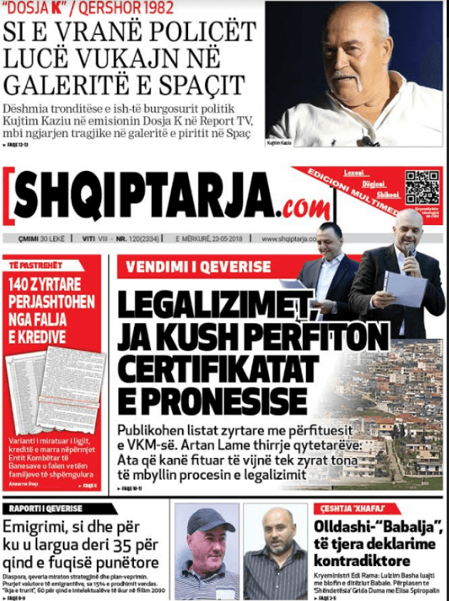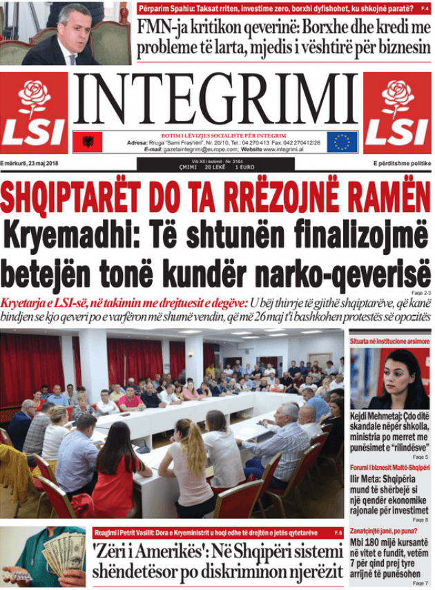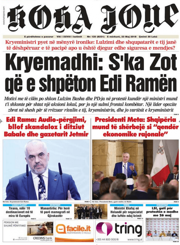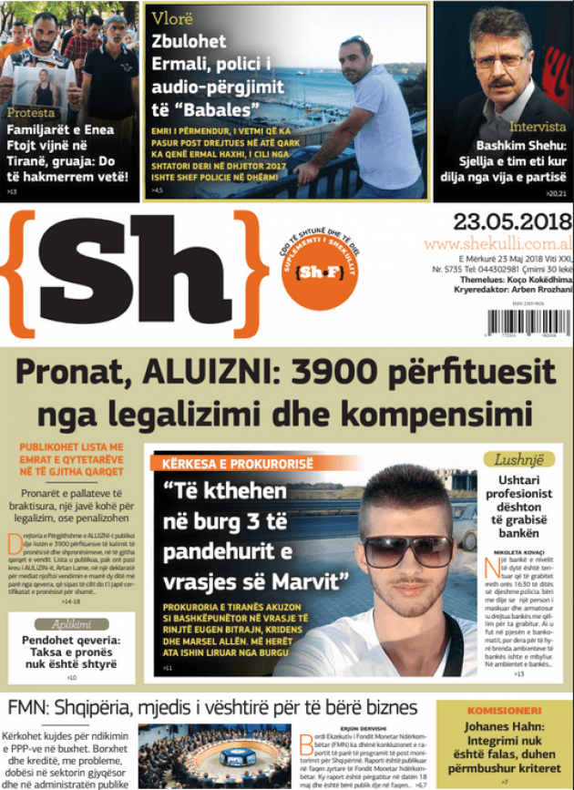 FOTO/ Faqet e para të shtypit të ditës, 23 maj 2018… KryesoretRisi By Pa frike Last updated Maj 23, 2018 77 Këto janë titujt kryesorë të gazetave të datës 23 maj 2018. faqet e paragazetatshtypi i dites 77 Ndaj FacebookTwitterLinkedinGoogle+