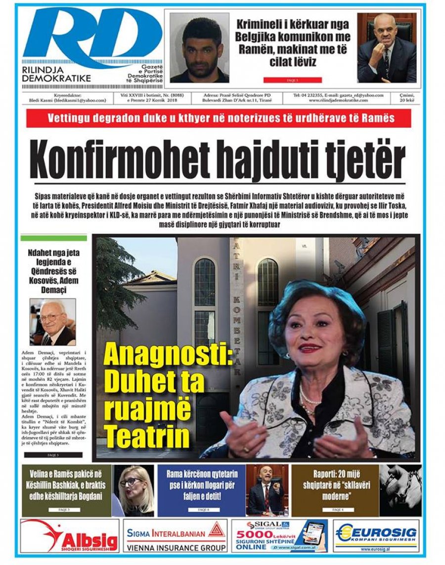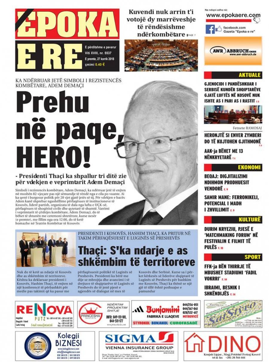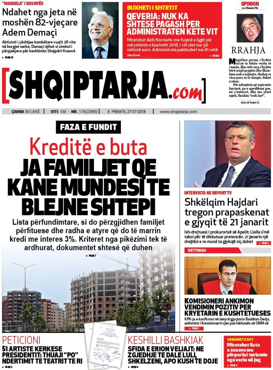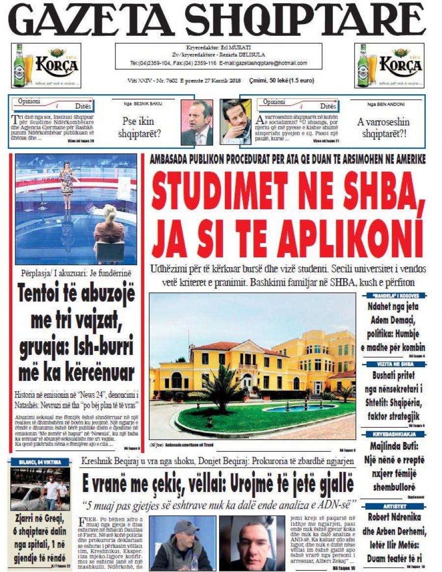 FOTO/ Faqet e para të shtypit të ditës, 27 korrik 2018… KryesoretRisi By Pa frike Last updated Kor 27, 2018 145 Këto janë titujt kryesorë të gazetave të datës 27 Korrik 2018. faqet e paragazetatshtypi i dites 145 Ndaj FacebookTwitterLinkedinGoogle+