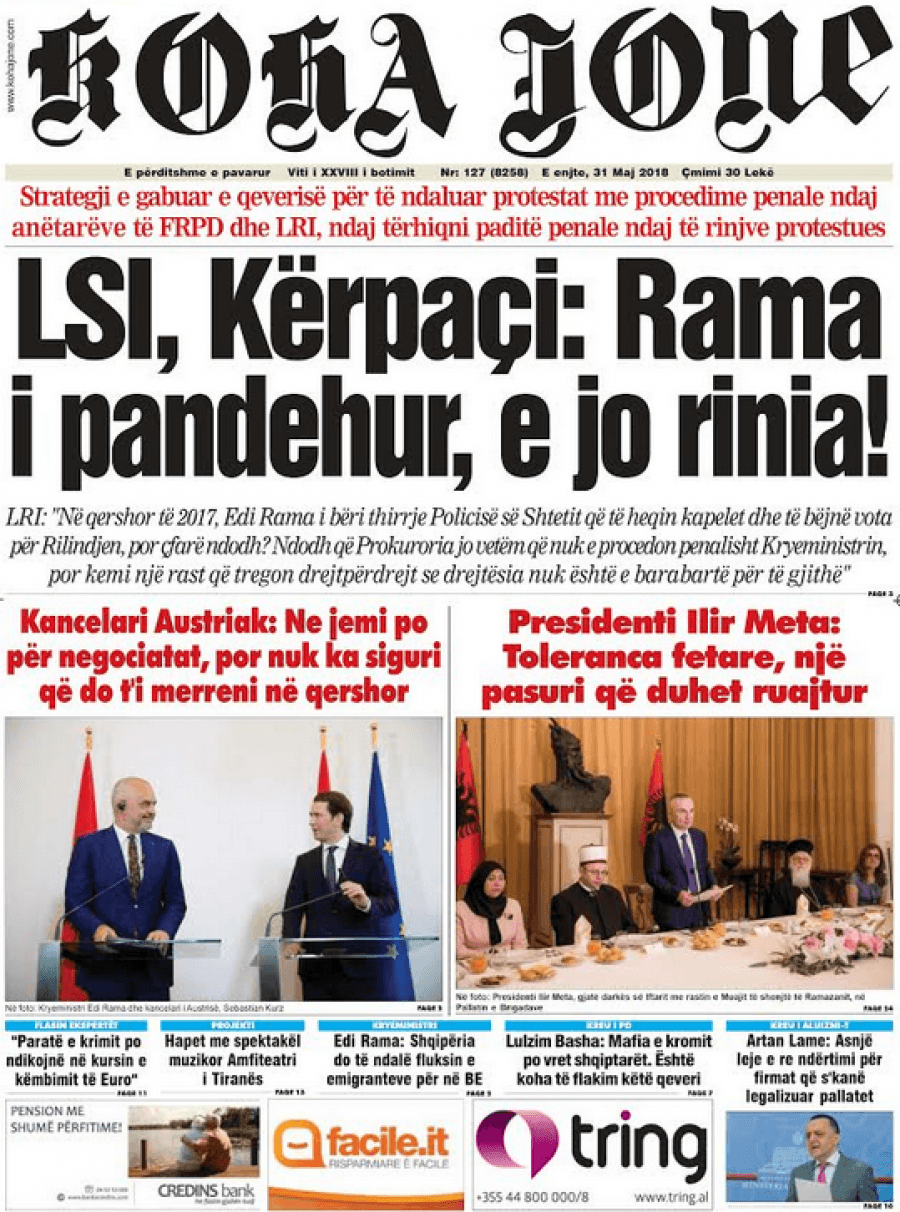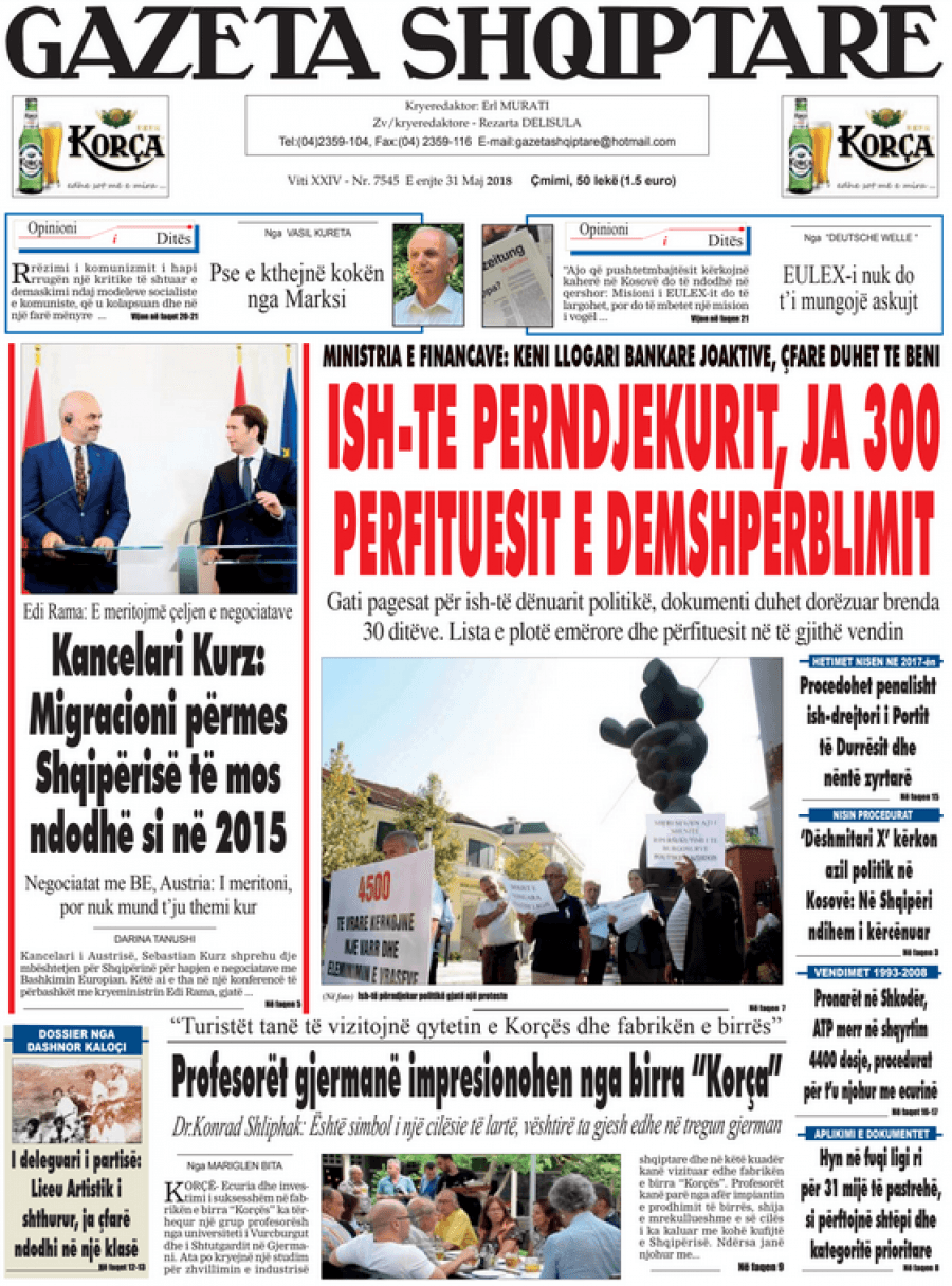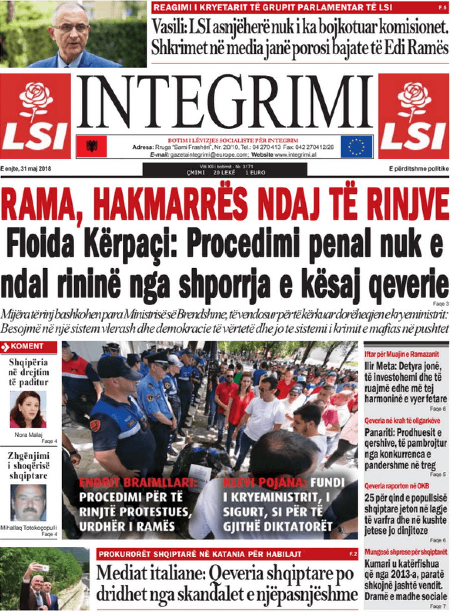 FOTO/ Faqet e para të shtypit të ditës, 31 maj 2018… KryesoretRisi By Pa frike Last updated Maj 31, 2018 59 Këto janë titujt kryesorë të gazetave të datës 31 maj 2018. faqet e paragazetatshtypi i dites 59 Ndaj FacebookTwitterLinkedinGoogle+