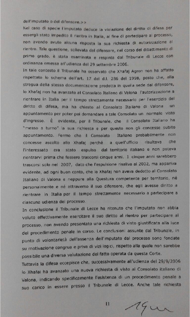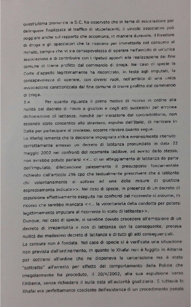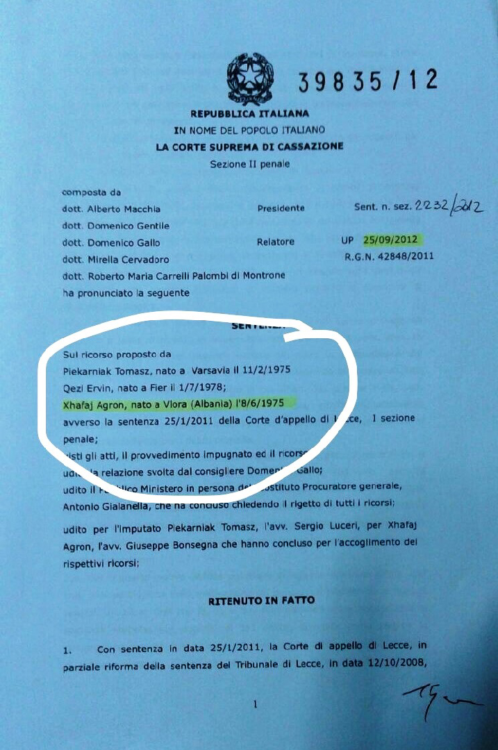 “Gjykata e Kasacionit është gjykata supreme e Italisë. Këto janë faqja kryesore, pjesa e vendimit për Agron Xhafajn dhe faqja e fundit”, tha PD në një konferencë për mediat duke publikuar disa prej faqeve të vendimit.