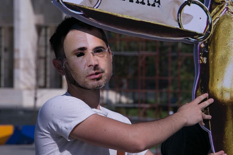Statujën e Drejtësisë 3 metra të lartë e mbajnë 10 të rinj të maskuar si Edi Rama, Fatmir Xhafaj, Saimir Tahiri, Agron Xhafaj, Moisiu Habilaj për të treguar se Drejtësia është vënë në shërbim të trafikut të drogës, krimit të organizuar dhe qeverisë së lidhur me të.