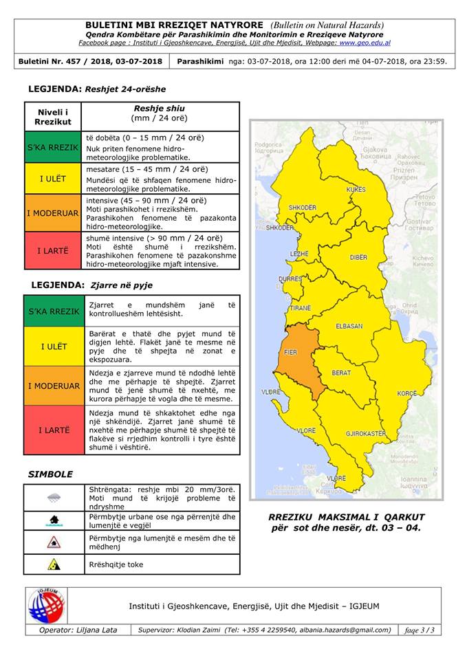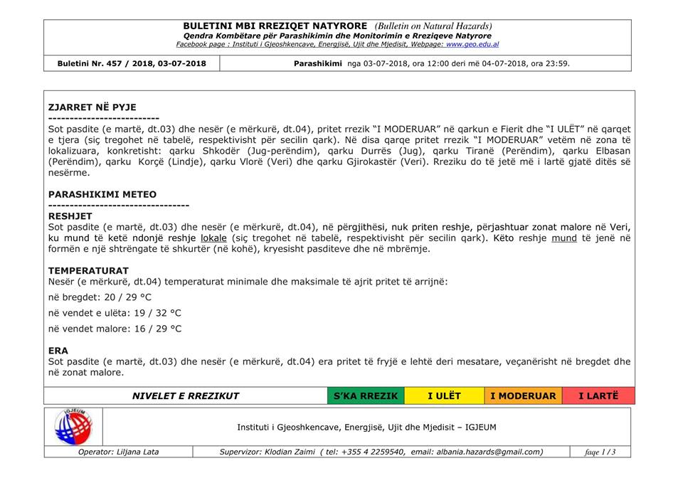 Sot pasdite (e martë, dt.03) dhe nesër (e mërkurë, dt.04), pritet rrezik “I MODERUAR” në qarkun e Fierit dhe “I ULËT” në qarqet e tjera (siç tregohet në tabelë, respektivisht për secilin qark). Nё disa qarqe pritet rrezik “I MODERUAR” vetёm nё zona tё lokalizuara, konkretisht: qarku Shkodër (Jug-perëndim), qarku Durrës (Jug), qarku Tiranë (Perëndim), qarku Elbasan (Perëndim), qarku Korçë (Lindje), qarku Vlorë (Veri) dhe qarku Gjirokastër (Veri). Rreziku do tё jetё mё i lartё gjatё ditёs sё nesërme.