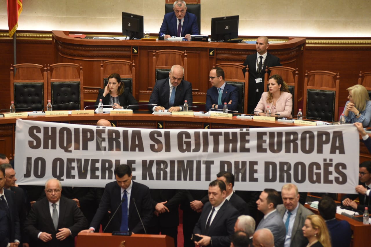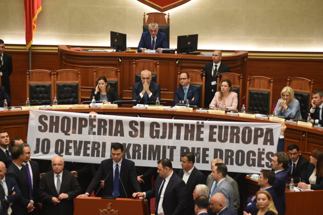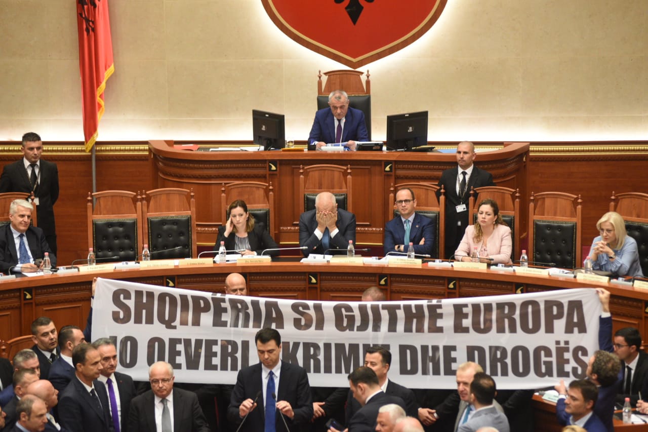 Deputetët e PD-së kanë shpalosur në Kuvend një pankartë ku shkruhej “Shqipëria si Europa, Jo qeveri e krimit dhe e drogës”.