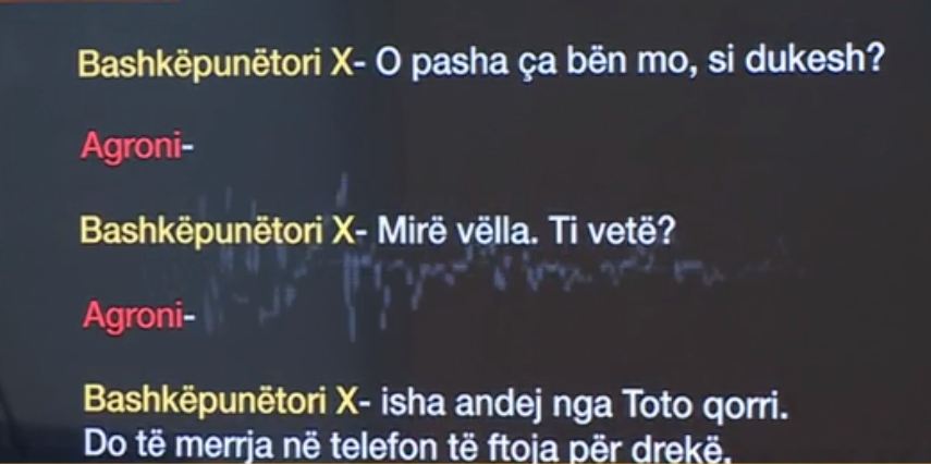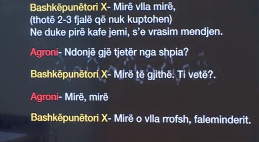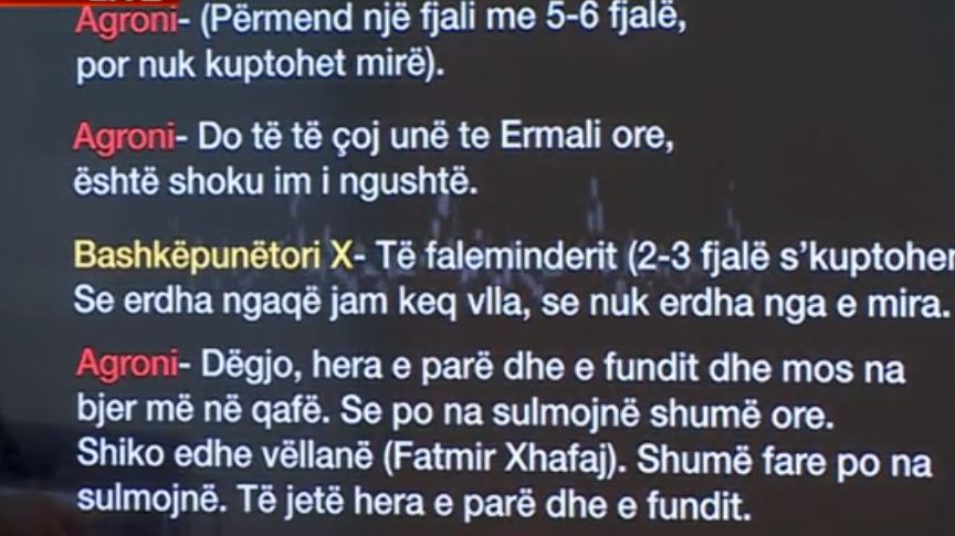 Biseda është përgjim ambiental dhe dëgjohet vetëm bashkëpunëtori X që po flet në telefon me Agronin.