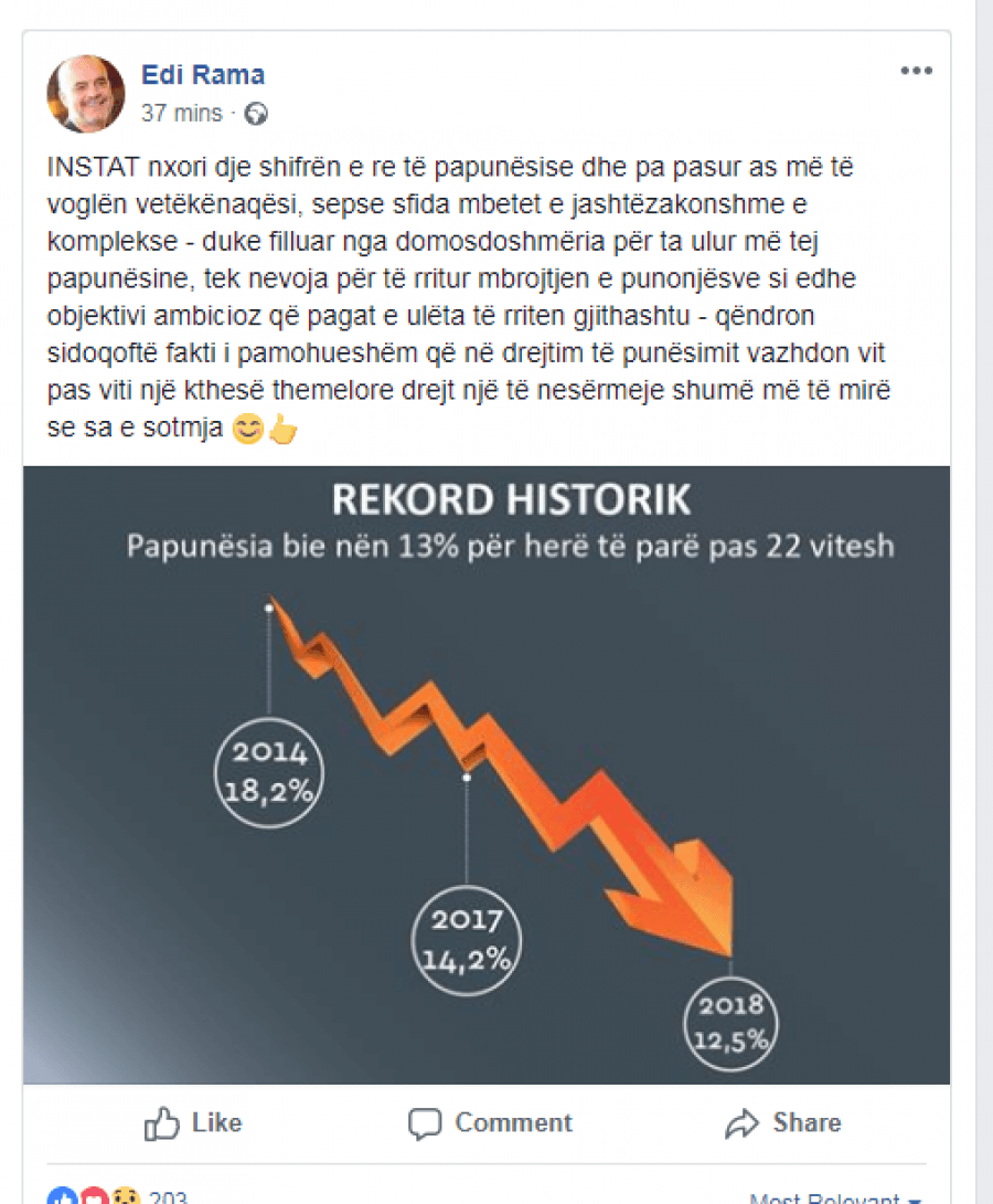 Ndërkohë sot, Kryeministri Edi Rama përmes një postimi në rrjet, thekson se INSTAT nxori shifrën e re të papunësise dhe pa pasur as më të voglën vetëkënaqësi, sepse sfida mbetet e jashtëzakonshme e komplekse – duke filluar nga domosdoshmëria për ta ulur më tej papunësine, tek nevoja për të rritur mbrojtjen e punonjësve si edhe objektivi ambicioz që pagat e ulëta të rriten gjithashtu – qëndron sidoqoftë fakti i pamohueshëm që në drejtim të punësimit vazhdon vit pas viti një kthesë themelore drejt një të nesërmeje shumë më të mirë se sa e sotmja.