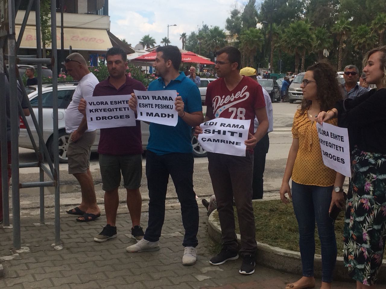 Një grup qytetarësh me pankarta në duar akuzojnë Kreun e Qeverisë si peshkun e madh dhe që ka kthyer Vlorën në kryeqytetin e drogës.
