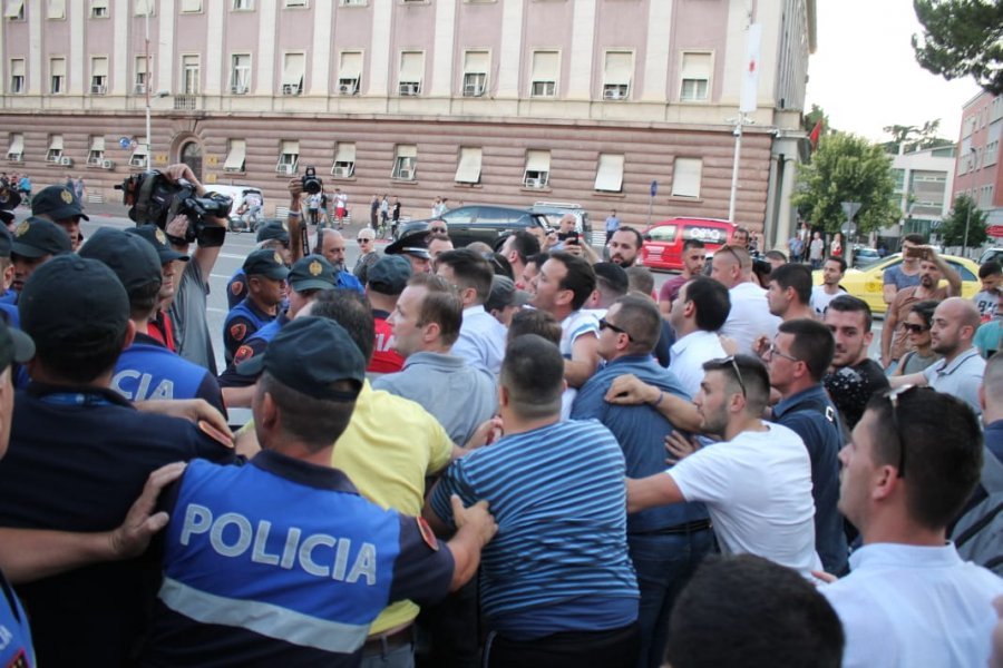 Për disa minuta protestuesit tentuan të vendosin banderolën në shkallën e Kryeministrisë, por një gjë e tillë nuk u lejua nga policia, e cila ishte bërë gardh në fillim të trotuarit para godinës.