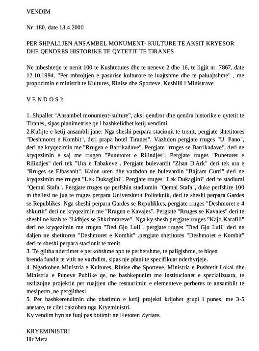Vendimi i parë është marrë nga qeveria në prill të vitit 2000. Vendimi shpalli “Ansambël Monument Kulture” Aksin Kryesor dhe Qendrën Historike të Qytetit të Tiranës.