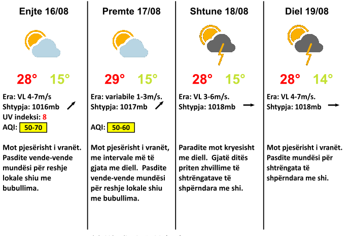 16.08-17.08 – Mot pjesërisht i vranët. Pasdite mundësi për reshje lokale shiu me shkrepëtima.