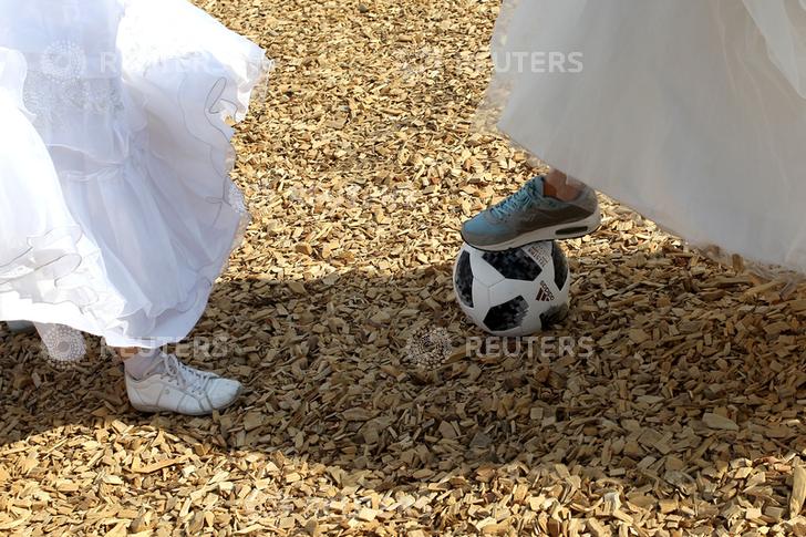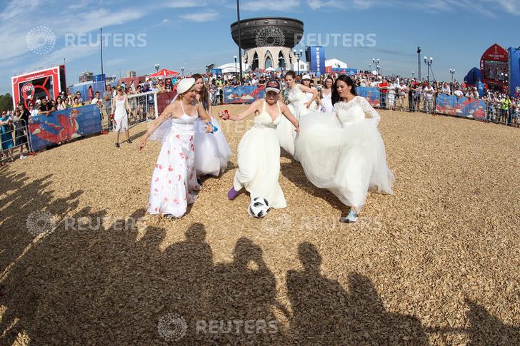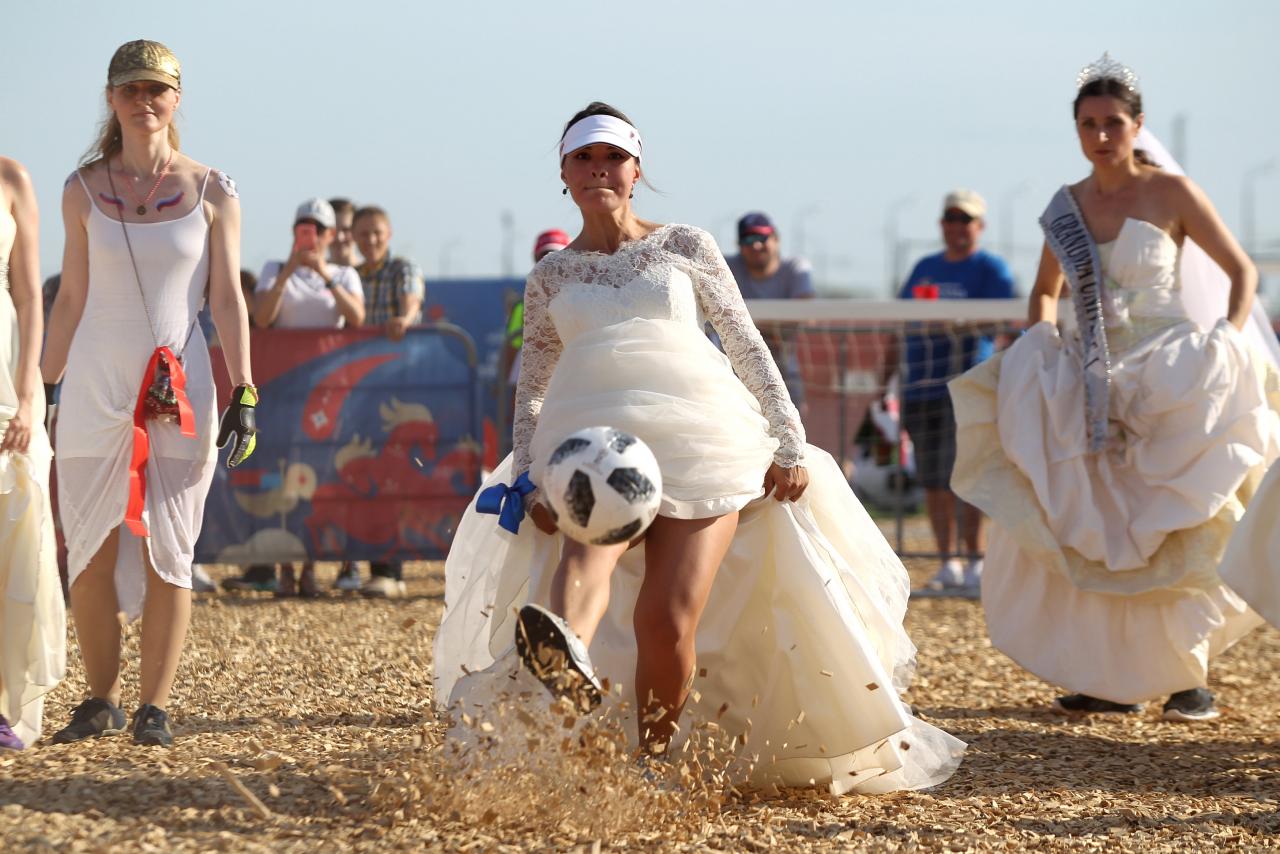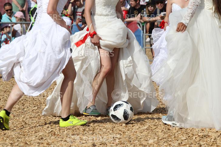 Të veshura me atlete dhe fustane nusërie, disa femra luajtën futboll duke argëtuar qindra spektatorë.