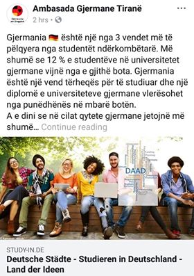 Gjermania, thekson Ambasada gjermane në Tiranë përmes rrejtit social Facebook, është një vend tërheqës për të studiuar dhe një diplomë e universiteteve gjermane vlerësohet nga punëdhënës në mbarë botën.