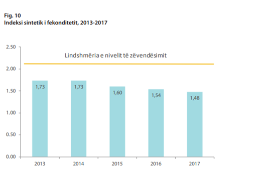Norma e fertilitetit në Shqipëri ka hyrë në një trend rënës që prej 2013-s. Në 2017-n norma mesatare e fertilitetit ishte 1.48, nga 1.54 që ishte një vit më parë. Kjo normë ishte dhe më e ulët se mesatarja e Bashkimit Europian në 2016-n. Lindjet mesatare për grua në Bashkimin Europian ishin 1.6. Kjo normë varion nga 1.94 lindje në Francë deri në 1.4 në Spanjë dhe në Itali.
