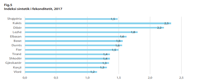 Dy qarqet me normë më të lartë lindshmëria janë Dibra dhe Kukësi me përkatësisht 2.2 dhe 2.3 lindje për grua.