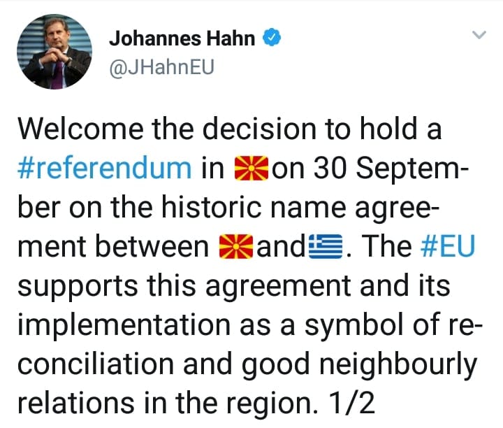 Komisionerii për zgjerim dhe fqinjësi të mirë i BE, Johannes Hahn duke përshëndetur vendimin e Parlamentit të Maqedonisë që më 30 shtator të mbahet referendumi për marrëveshjen me Greqinë ftoj të gjithë qytetarët e Maqedonisë që të shfrytëzojnë të drejtën e tyre demokratike, pasi sipas tij, bëhet fjalë për vendin dhe të ardhmen e tyre.