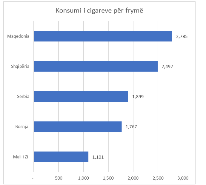 Sipas tobaccoatlas.org konsumin më të ulët të cigares në rajon e ka Mali i Zi me 1101 cigare. Më pas renditet Bosnje dhe Hercegovina ku konsumi i cigares është 1767, e ndjekur nga Serbia me 1899 cigare.