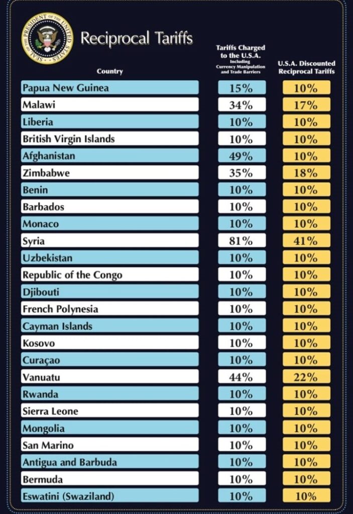 Ndryshe për vendet tjera janë vendosura këto tarifa: BE 20 për qind, Kina 34 për qind, Vietnami 46 për qind, Taiwani 32 për qind, Japonia 24 për qind, India 26 për qind, Korea e Jugut 25 për qind, Tailanda 36 për qind, Zvicra 31 për qind, Mbretëria e Bashkuar 10 për qind, Afrika e Jugut 30 për qind, Malajzia 24 për qind…