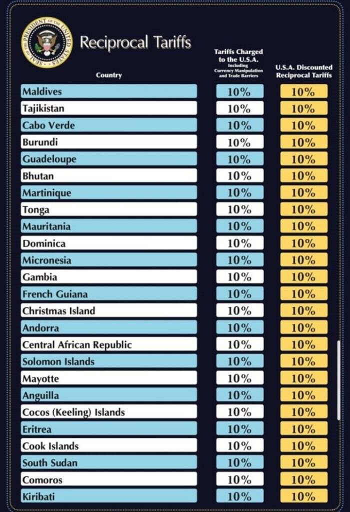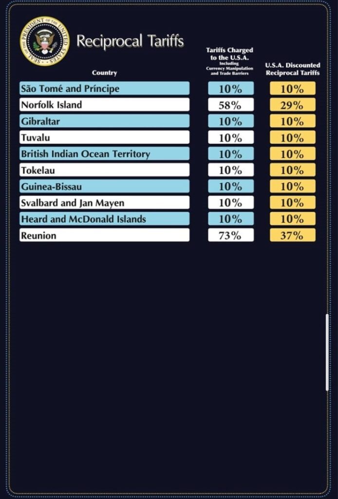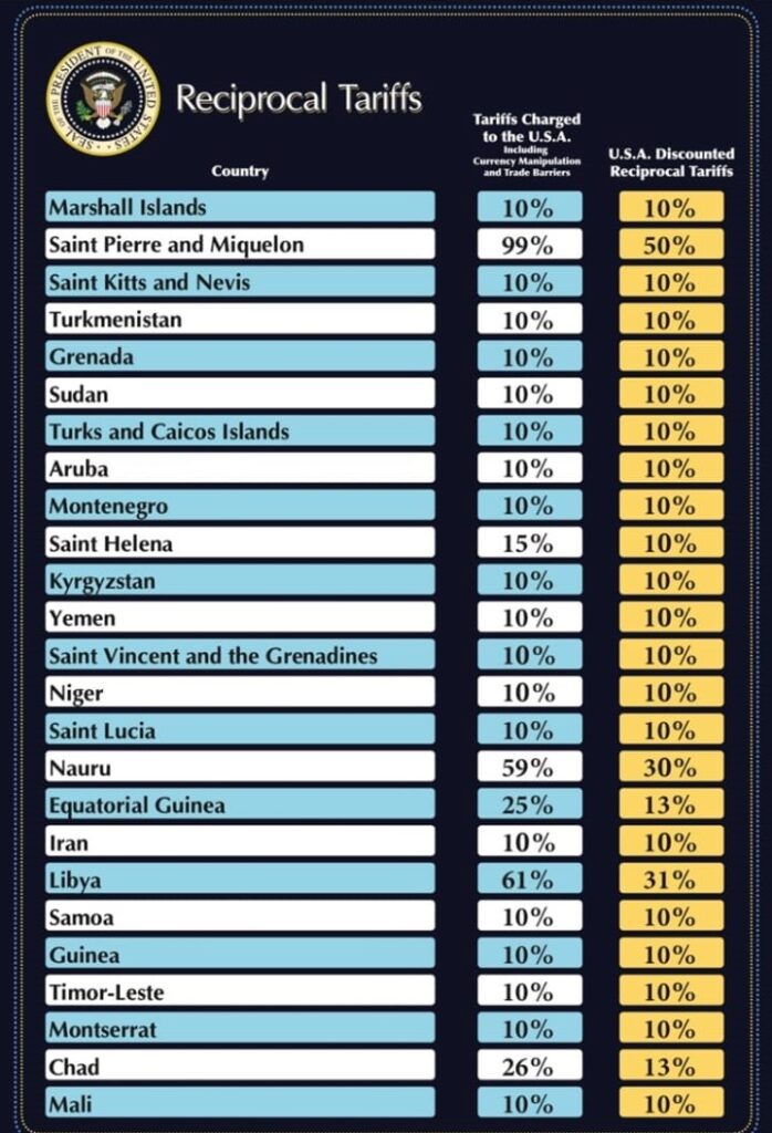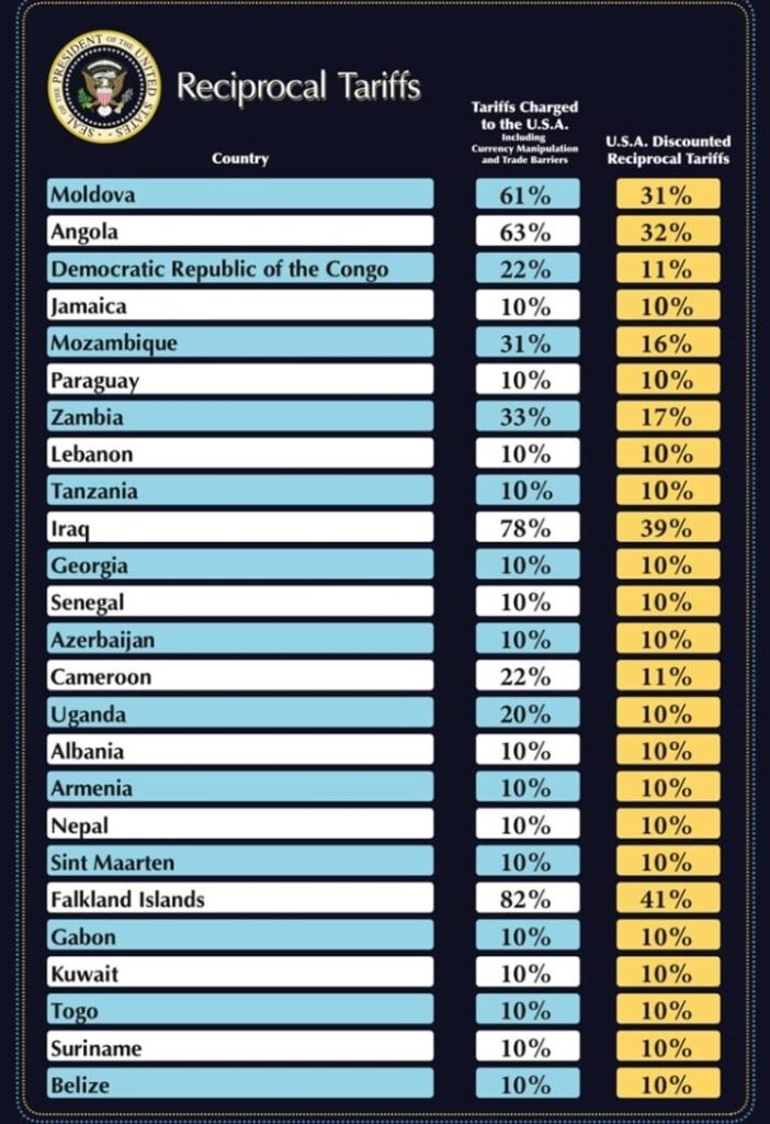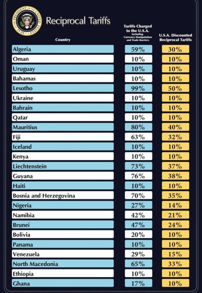 Pasi Presidenti i Shteteve të Bashkuara, Donald Trump, shpalli mbrëmë emergjencë ekonomike kombëtare dhe vendosi tarifa që sipas tijë pritet të prodhojnë qindra miliarda dollarë të ardhura vjetore ndërsa vendet e punës në fabrika do të kthehen në SHBA si rrjedhojë e këtyre tarifave, sot kur filloi zbatimi, 3 Prilli 2025, ndryshe nga retorikat që u dë u gjuan më parë, të goditurit nga kjo tarifë kanë reagime më të moderuara deri në zgjidhjen me dialog sipas Presidentes së Komisionit Evropian Ursula vod der Leyen.