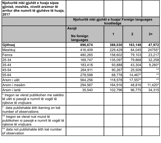 Rreth 900 mijë shqiptarë të moshës mbi 25 vjeç nuk zotërojnë asnjë gjuhë të huaj. Shifra u përpilua nga INSTAT në kuadër të anketës mbi njohuritë për gjuhët e huaja në moshat mbi 25 vjeç për vitin 2017.