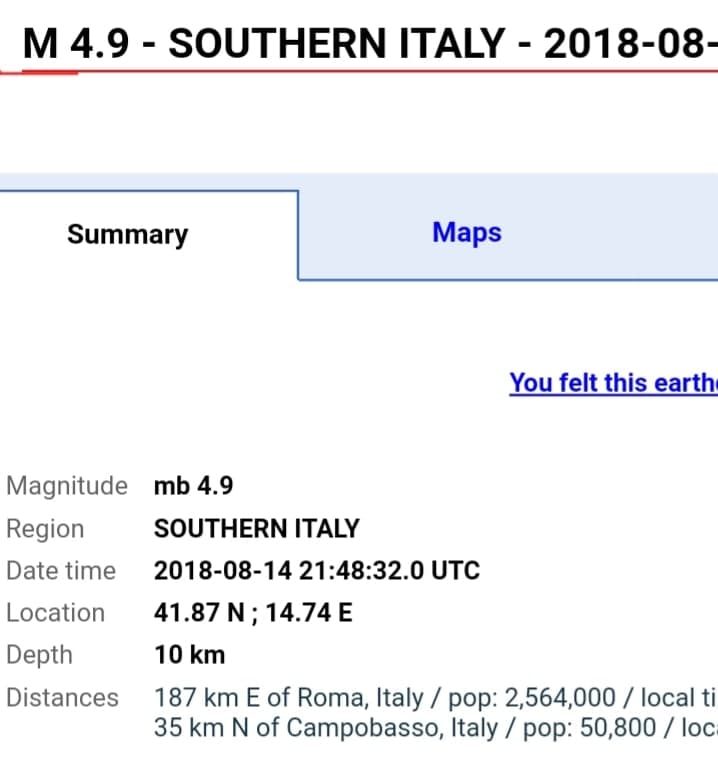 Lëkundja e tërmetit është regjistruar rreth orës 23:48, 35 kilometra nga Campobasso dhe 187 kilometra nga Roma.