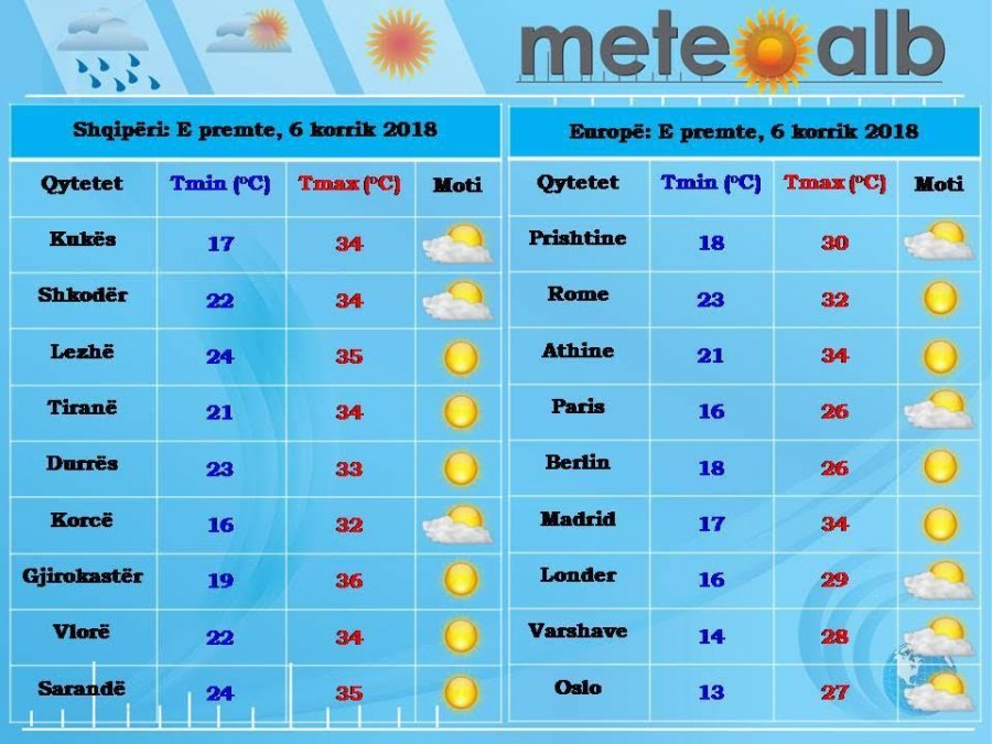 Ndërsa vranësira të shpeshta dhe shira të përkohshëm do të ketë në zonën e Alpeve të Europës dhe pjesërisht në zonat Qendrore të saj.