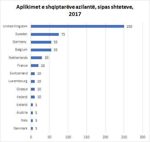 Numri më i lartë i aplikimeve nga Shqipëria ishte në Mbretërinë e Bashkuar, me 250 fëmijë të pashoqëruar, të ndjekur nga Suedia me 75 dhe Belgjika e Gjermania, me përkatësisht 55 fëmijë.