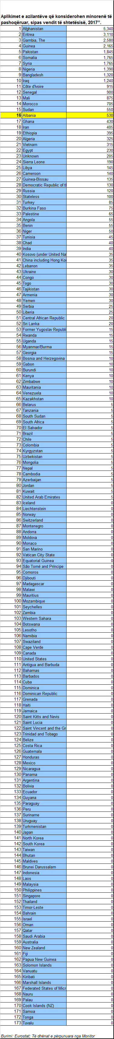 Kërkesat e fëmijëve të pashoqëruar shqiptarë për azil në vendet e BE-së përbëjnë numrin më të lartë të kërkesave për azil nga fëmijë të pashoqëruar në të gjithë Europën, ndërsa jemi në vendin e 16 në botë, pas shteteve që ikin luftës, si Afganistani, Siria, Iraku etj, (shiko tabelën).