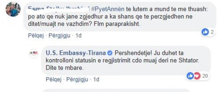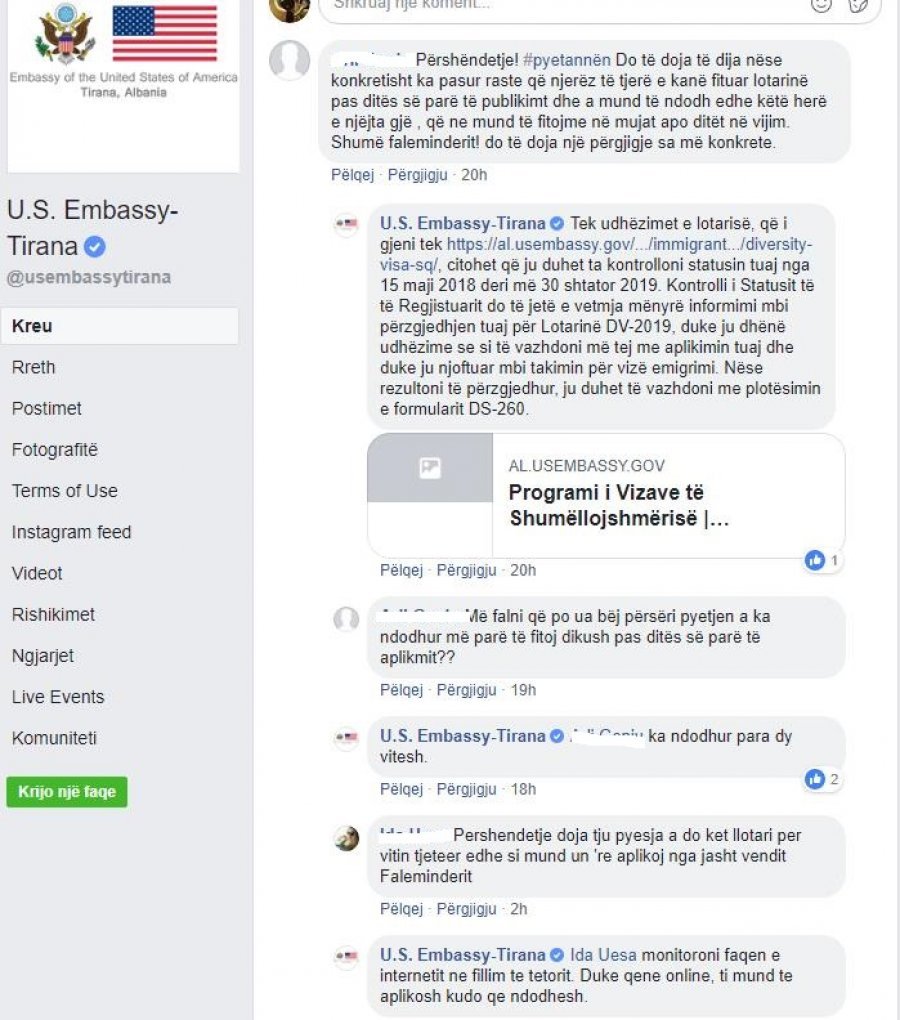 Në përgjigjet që u ka dhënë qytetarëve të enjten lidhur me Loton Amerikane, Ambasada e SHBA në Tiranë i përgjigjet qytetarëve në Facebook, në profilin e saj, si më poshtë: