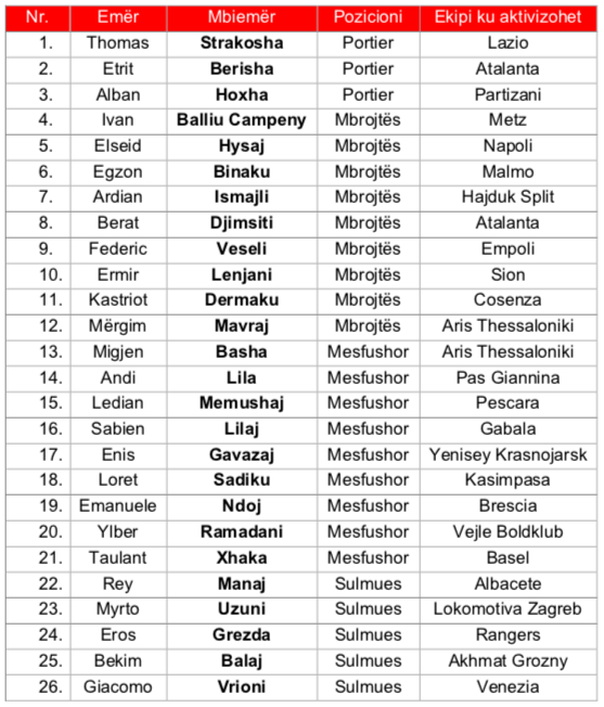 Risia në listën e përpiluar nga tekniku italian i kuqezinjve është grumbullimi për herë të parë i mbrojtësit të Hajdukut të Splitit, Ardian Ismajli, si dhe të mesfushorit Loret Sadiku.