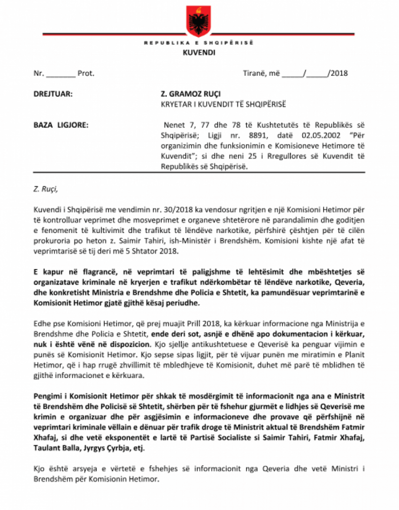 “Për këtë qëllim, kërkojmë nga Kuvendi i Shqipërisë qëndrim të prerë ndaj aktit të pengimit të veprimtarisë së Komisionit Hetimor, duke marrë masat e duhura për të vënë përpara përgjegjësisë politike dhe ligjore Ministrin e Brendshëm dhe Drejtorin e Përgjithshëm të Policisë së Shtetit. Pengimi i qëllimshëm i Komisionit Hetimor përbën shpërdorim detyre, që sjell shkarkim nga detyra dhe përgjegjësi penale.”