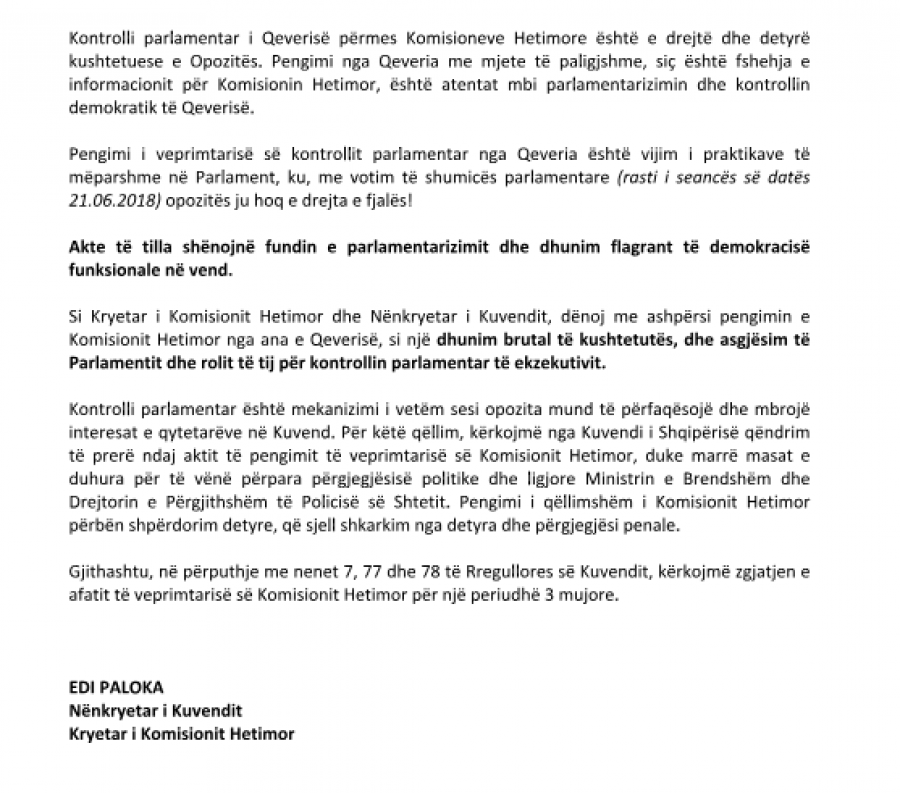 “Edhe pse Komisioni Hetimor, që prej muajit Prill 2018, ka kërkuar informacione nga Ministria e Brendshme dhe Policia e Shtetit, deri më sot, në kundërshtim me Kushtetutën dhe me ligjin, Komisionit nuk i është vënë në dispozicion asnjë e dhënë apo dokumentacion i kërkuar, duke pamundësuar punën e tij, “ thekson Edi Paloka