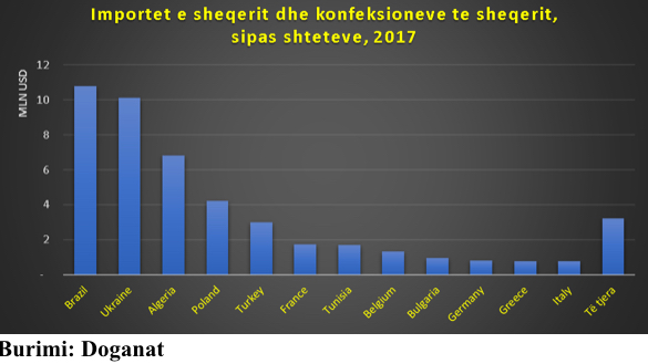 Të dhënat zyrtare tregojnë se dy shtete kryesoret nga importohet sheqeri janë Brazili dhe Ukraina, me përkatësisht 24% dhe 22% të totalit.