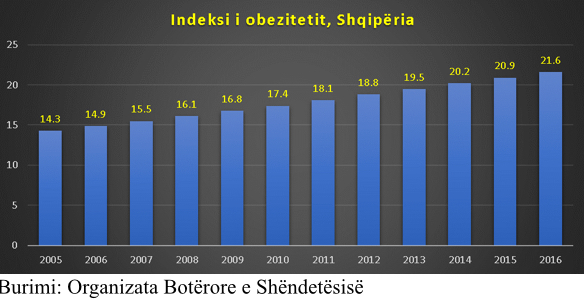 Shqiptarët kanë qenë shumë më elegantë 10 vjet më parë. Të dhënat e Organizatës Botërore të Shëndetësisë, që prevalenca e obezitetit te të rriturit në Shqipëri arriti në 21.6% të popullsisë në vitin 2016, nga 14.9% që ishte ky tregues 10 vjet më parë, në 2006-n. Në krahasim me 2014-n, kur kishim prevalencën më të ulët në rajon për sa i përket obezitetit, Shqipëria renditet tashmë në vendin e tretë. Në vendin e parë me prevalencë më të lartë është Mali i Zi me 23.3%.Të dytët me normë më të lartë janë maqedonasit, ku sipas të dhënave për vitin 2016, prevalenca e obezitetit ishte 22.4%. Ndërsa më elegantët e rajonit janë boshnjakët me 17.9% dhe serbët me 21.5%.