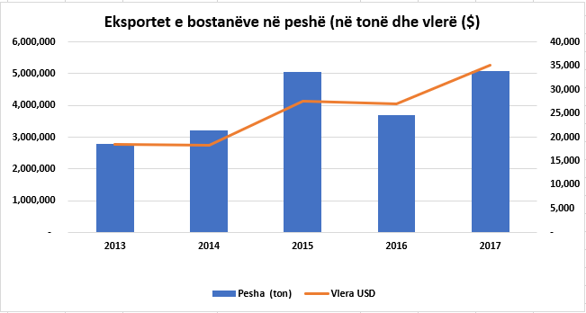 Ekpsortet e bostanorëve kanë qenë në rritje në 2017-n (shiko grafikun). Sipas të dhënave u eksportuan 33 mijë e 344 tonë bostanë jashtë me një vlerë prej 5.2 miliardë dollarë. Vendi që ka sasinë më të madhe të eksportuar të bostanëve nga shqipëria në 2017-n është Serbia, me një vlerë prej 1.7 milionë dollarë, në vend të dytë është Çekia me 1.3 milionë dollarë. Më pas renditen vendet e rajonit si Bosnja 751 mijë dollarë, Kroacia me 359 dollarë dhe Maqedonia me 312 mijë dollarë.