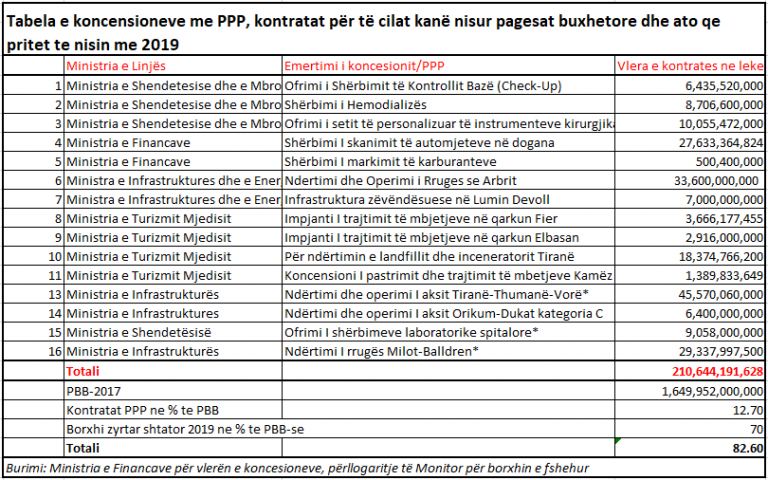 Në projektbuxhetin e vitit 2019, qeveria ka programuar të kontraktojë me PPP, 3 akse rrugore, 2 aeroporte, 6 shkolla në Tiranë dhe 1 spital rajonal në Fier. Kontratat në fuqi dhe ato të projektuara për 2019 arrijnë një vlerë sa 21.8% e PBB-së. Kjo shumë nuk është përfshirë në llogaritë e borxhit publik, por qeveria, nëpërmjet buxheteve vjetore, përllogarit pagesat vjetore të cilat nuk duhet të jenë më shumë se 5% të të ardhurave tatimore.