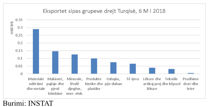 Produkti më i eksportuar janë “Materiale ndërtimi dhe metale”, me 33% të totalit (shih grafikun). Njëngadalësim i ekonomisë turke, si rrjedhojë e krizës financiare do të ulte dhe kërkesën për produkte shqiptare, po sërish ndikimi do të jetë i ulët për shkak të peshës sëpapërfillshme.